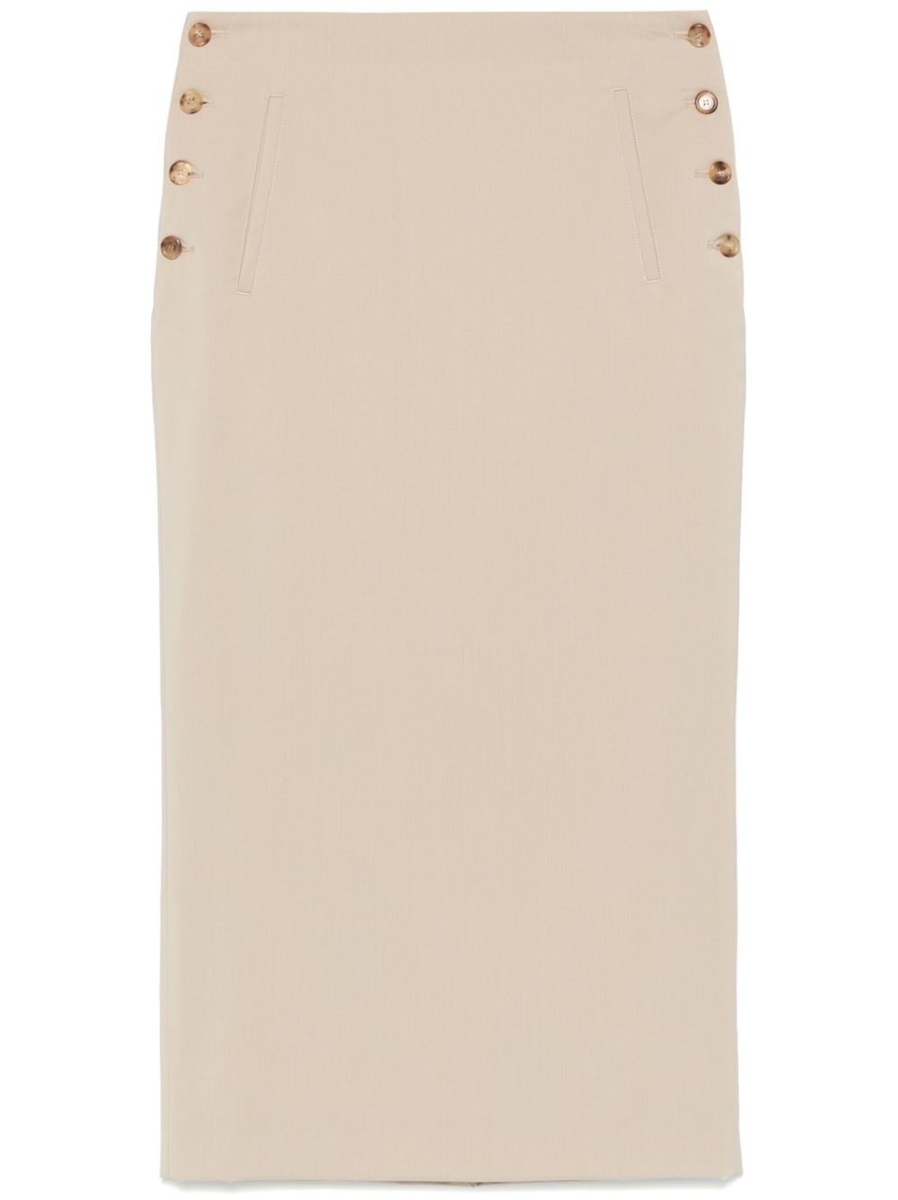 virgin-wool midi skirt Highlights - Light beige - Side button fastening - Two front welt pockets - Rear flap pocket - Rear welt pocket Made in Italy Composition Virgin Wool 100% SIZE & FIT Model measurements Height 5 ft 10 in(1.77 m) Bust/Chest 29.92 in(76 cm) Hips 34.25 in(87 cm) Waist 23.62 in(60 cm) FittingInformation This midi-length skirt is intended to be worn just below the waist The vented hem offers movement at the rear Made from a midweight non-stretch fabric