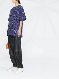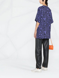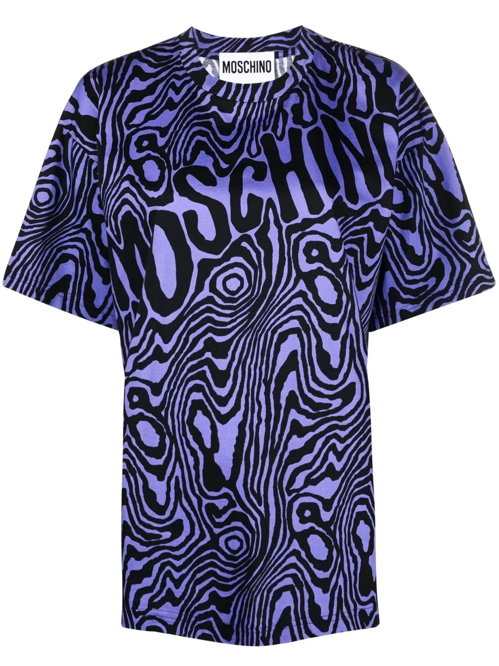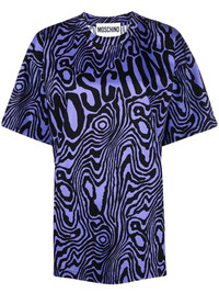 zebra-print round-neck T-shirt Crafted from cotton with a relaxed cut, this round-neck T-shirt from Moschino boasts an all-over zebra print in purple and black tones. Note the brand's logo print at the chest. Made in Italy Composition Cotton 100% SIZE & FIT Model measurements Height 5 ft 11 in(1.8 m) Bust/Chest 31.49 in(80 cm) Hips 35.43 in(90 cm) Waist 25.19 in(64 cm) FittingInformation This piece fits true to size. We recommend you get your regular size Cut for an oversized fit Made with a mid-weight fabric Washing instructions Machine Wash