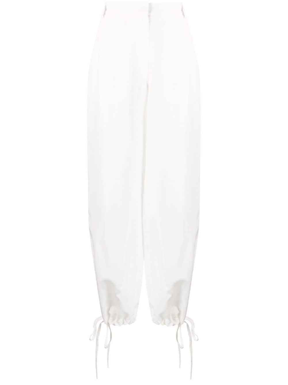 elasticated-waist trousers MSGM imbues these trousers with its relaxed aesthetic thanks to an elasticated waistband and lace-up detailing at the ankle. Highlights - White - Elasticated waistband - Belt loops - Two rear flap pockets - Elasticated ankles Made in Italy Composition Lining: Polyester 100% Outer: Viscose 75%, Linen/Flax 25% SIZE & FIT Model measurements Height 5 ft 10 in(1.79 m) Bust/Chest 31.1 in(79 cm) Hips 35.03 in(89 cm) Waist 24.01 in(61 cm) FittingInformation Designed with a wide-leg cut, these trousers allow for a close fit at the waist and offer a loose and roomy fit over the leg The partially elasticated waistband offers increased movement and comfort at the waist Made from a midweight non-stretch fabric This piece fits true to size – take your usual size Washing instructions Dry Clean Only