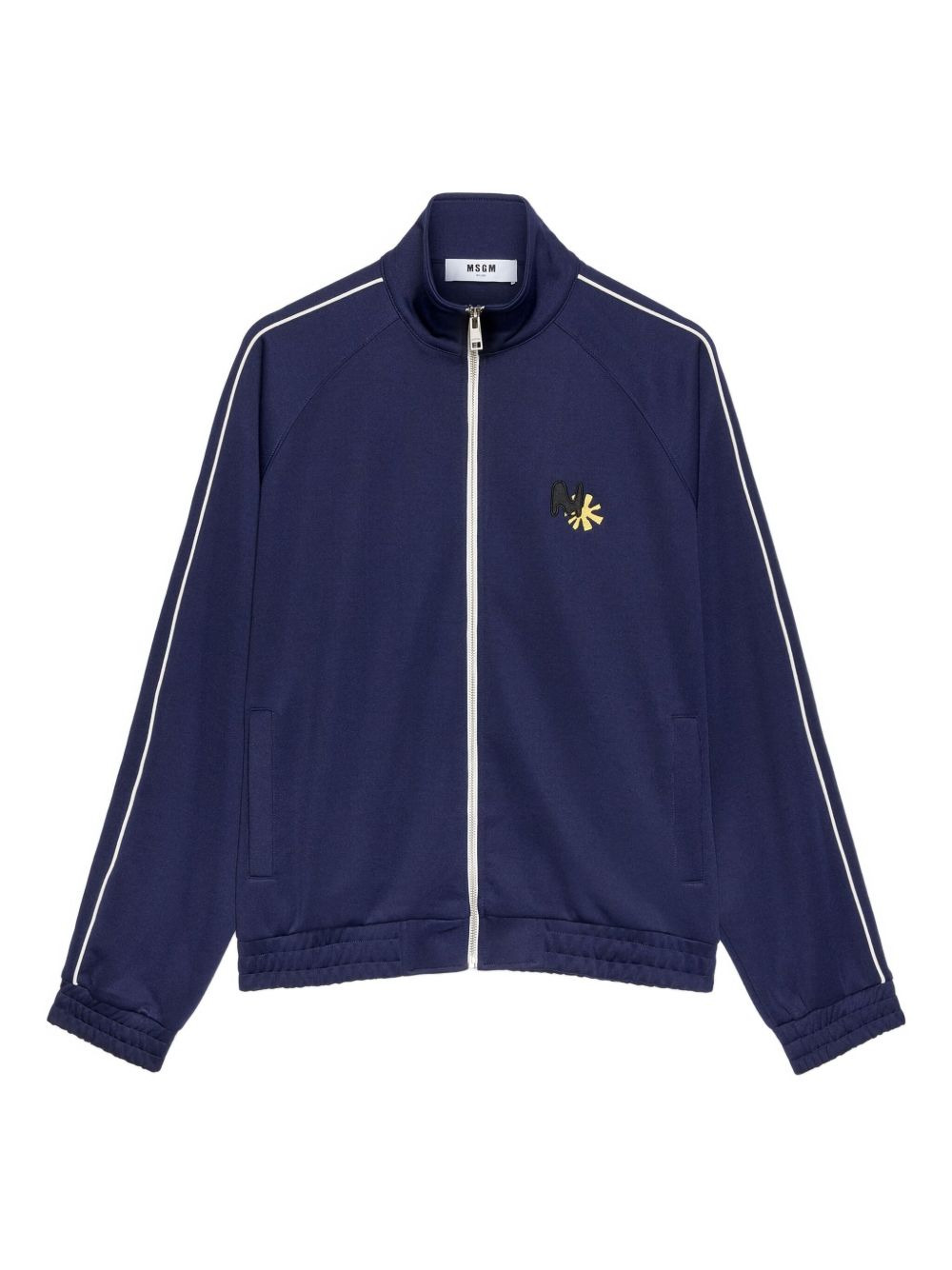 embroidered track jacket Highlights - Navy blue - Front zip fastening - Ribbed cuffs - Embroidered detail - High neck Imported Composition Polyester 54%, Cotton 46% Washing instructions Read Manufacturer Guidelines