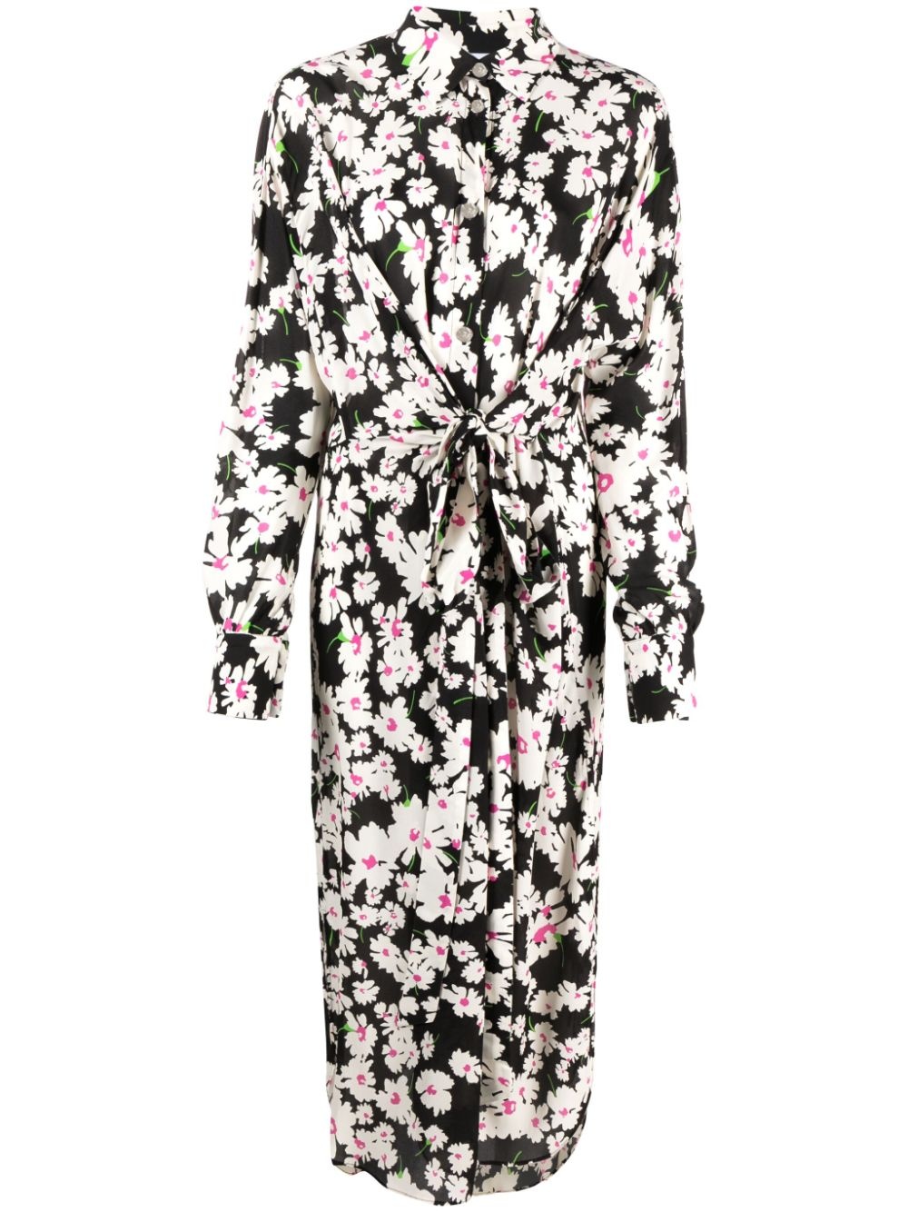 floral-print tie-fastening cady midi dress Highlights - Black/multicolour - Cady texture - All-over floral print - Pointed flat collar - Front button fastening - Front tie fastening - Drop shoulder - Long sleeves - Buttoned cuffs - Straight hem - Unlined Made in Italy Composition Viscose 100% SIZE & FIT Model measurements Height 5 ft 9 in(1.76 m) Bust/Chest 31.88 in(81 cm) Hips 35.43 in(90 cm) Waist 24.8 in(63 cm) Washing instructions Dry Clean Only