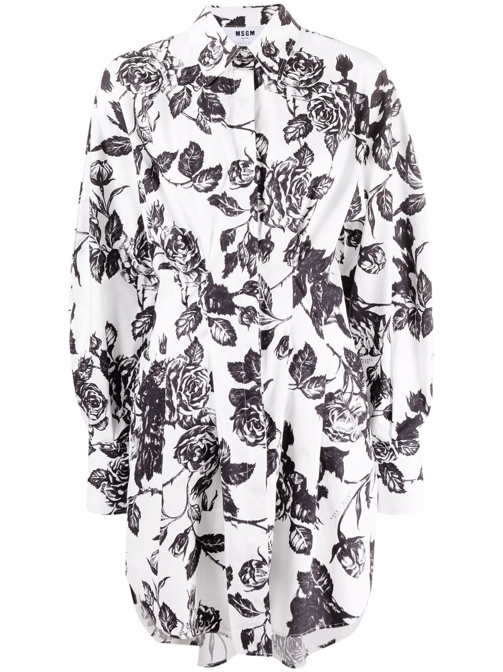 floral shift shirt dress black/white cotton all-over floral print shift style button-down collar long sleeves Made in Italy Composition Cotton 100% SIZE & FIT Model measurements Height 5 ft 10 in(1.78 m) Bust/Chest 32.28 in(82 cm) Hips 35.03 in(89 cm) Waist 23.22 in(59 cm) FittingInformation This piece fits true to size. We recommend you get your regular size Designed for a loose fit with a close fit at the waist Made with a mid-weight non-stretch fabric Washing instructions Machine Wash