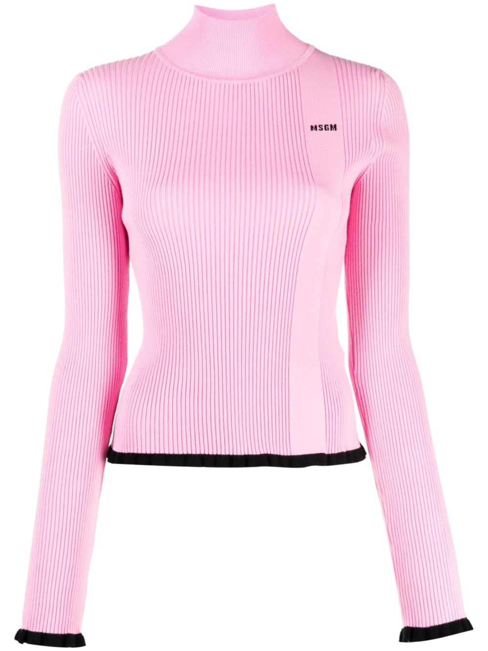 intarsia-knit logo ribbed knit jumper Highlights - Bubblegum pink - Ribbed knit - Intarsia-knit logo - Contrasting trim - Ruffled trim - High neck - Long sleeves Made in Italy Composition Viscose 70%, Polyester 30% SIZE & FIT Model measurements Height 5 ft 10 in(1.78 m) Bust/Chest 31.49 in(80 cm) Hips 37 in(94 cm) Waist 23.62 in(60 cm) Washing instructions Machine Wash