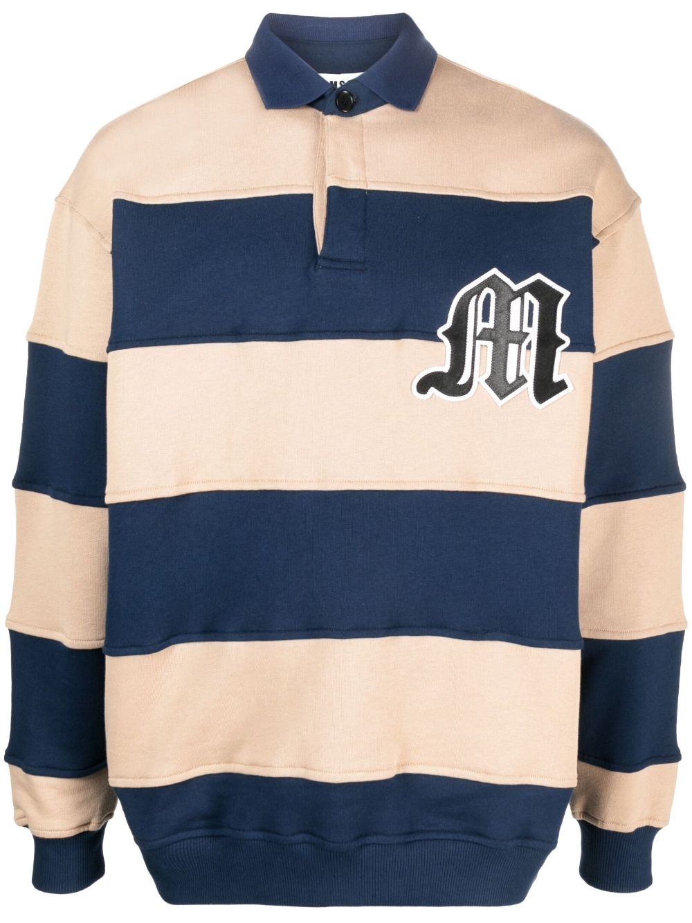 logo-patch striped polo sweatshirt Highlights - Beige/navy blue - Cotton - Horizontal stripe pattern - Logo patch at the chest - Polo collar - Short front button fastening - Long sleeves - Ribbed cuffs and hem Made in Italy Composition Cotton 100% SIZE & FIT Model measurements Height 6 ft 0 in(1.84 m) Bust/Chest 36.22 in(92 cm) Hips 35.43 in(90 cm) Waist 26.77 in(68 cm) FittingInformation Designed to be unstructured, offering a loose fit throughout Made from a midweight non-stretch fabric, this piece offers minimal elasticity when worn This piece fits true to size – take your usual size Washing instructions Hand Wash