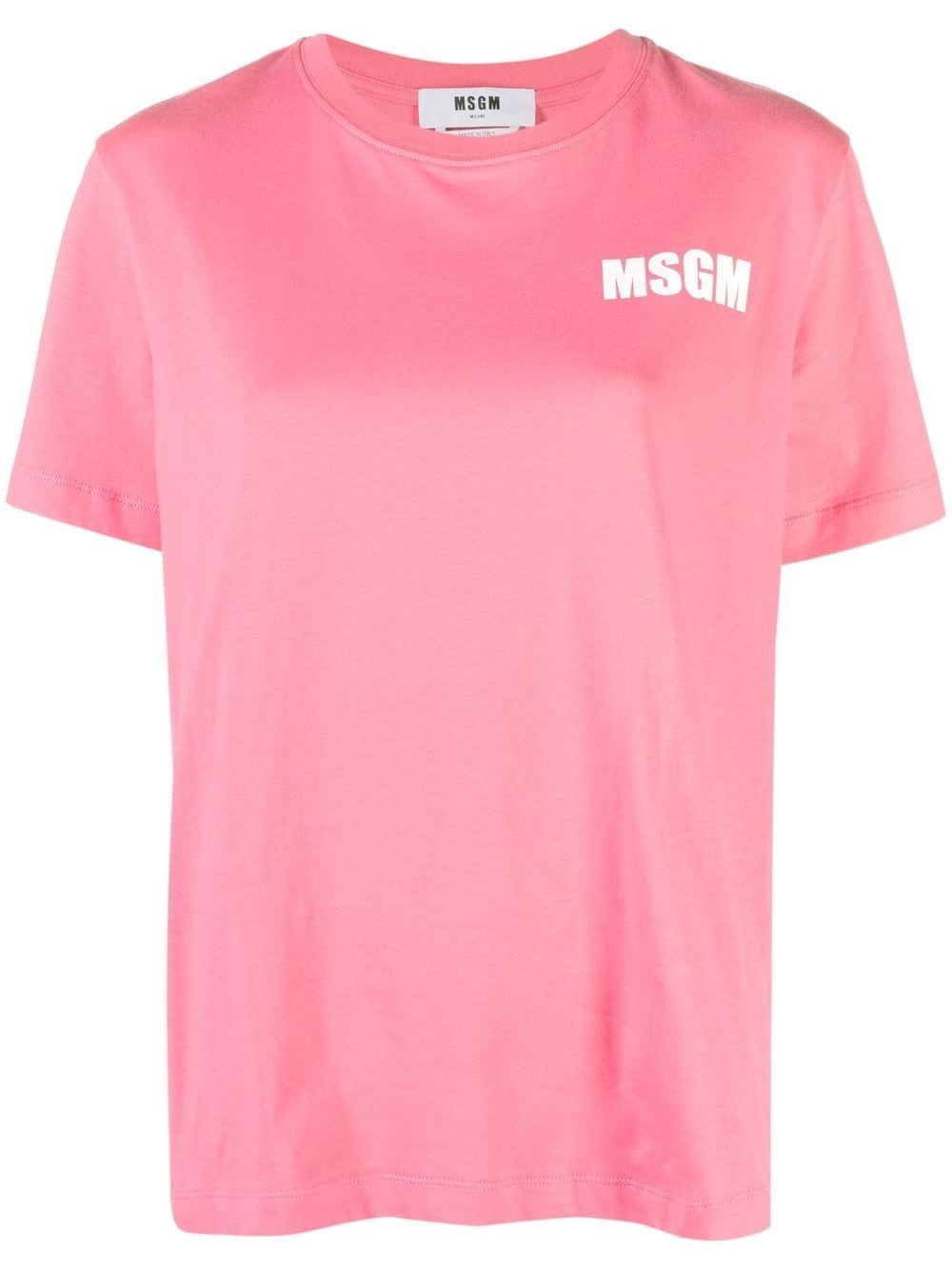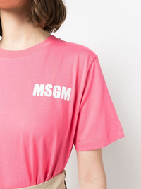 logo-print cotton T-shirt pink cotton logo print at the chest logo print to the rear round neck short sleeves straight hem Made in Italy Composition Cotton 100% SIZE & FIT Model measurements Height 5 ft 10 in(1.79 m) Bust/Chest 32.67 in(83 cm) Hips 34.25 in(87 cm) Waist 24.4 in(62 cm) FittingInformation This piece fits true to size. We recommend you get your regular size Cut for a relaxed fit Made with a mid-weight fabric Washing instructions Hand Wash