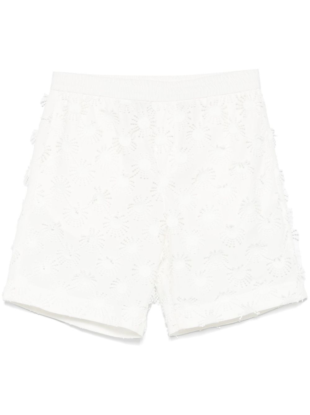 motif-embroidered shorts Highlights - White - Elasticated waistband with internal drawstring - Two side inset pockets - Rear patch pocket - 3d detailing Made in Italy Composition Polyester 66%, Cotton 34% SIZE & FIT Model measurements Height 6 ft 2 in(1.87 m) Bust/Chest 38.97 in(99 cm) Hips 37.99 in(96.5 cm) Waist 29.52 in(75 cm) FittingInformation Designed for relaxed fit, offering a comfortable loose fit over the leg The elasticated waist allows for a comfortable fit Made from a midweight non-stretch fabric, this piece offers minimal elasticity when worn