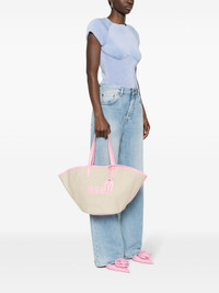 New logo-print tote bag Highlights - Ecru, pink - Cotton - Leather trim - Two flat top handles - Logo charm - Logo print to the front - Main compartment - Internal zip-fastening pocket - Debossed internal logo - Unlined - Concealed magnetic fastening Imported Composition Outer: Calf Leather 100%, Cotton 100% SIZE & FIT Model measurements Height 5 ft 10 in(1.77 m) Bust/Chest 32.28 in(82 cm) Hips 35.03 in(89 cm) Waist 25.19 in(64 cm) Measurement DEPTH 5.9 in(15 cm) HANDLE 8.66 in(22 cm) HEIGHT 9.84 in(25 cm)