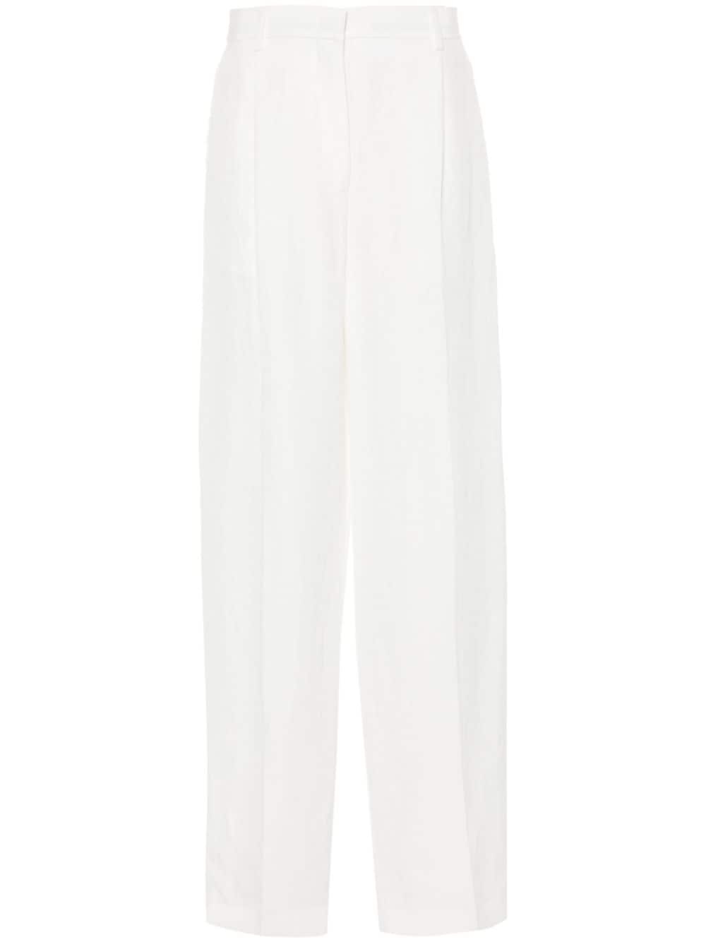 pleat-detail trousers Highlights - White - Linen blend - Slub texture - Pleat detailing - Pressed crease - Belt loops - Two side inset pockets - Rear welt pocket - Concealed front button, hook and zip fastening Made in Italy Composition Outer: Linen/Flax 56%, Viscose 44% Lining: Polyester 100% SIZE & FIT Model measurements Height 5 ft 11 in(1.8 m) Bust/Chest 33.07 in(84 cm) Hips 37.4 in(95 cm) Waist 25.19 in(64 cm) FittingInformation Designed for a straight-leg fit, these trousers allow for a close fit at the waist and an unrestricted, comfortable fit over the leg Made from a midweight non-stretch fabric This piece fits true to size – take your usual size