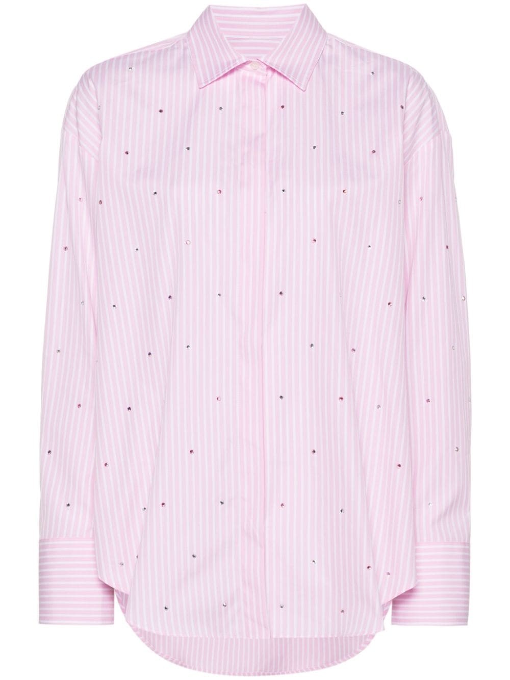 rhinestone-embellished shirt Highlights - Light pink/white - Cotton - Poplin texture - Vertical stripe pattern - Rhinestone embellishment - Embroidered logo to the rear - Classic collar - Long sleeves - Buttoned-cuff sleeves - High-low curved hem - Concealed front button fastening Made in Italy Composition Cotton 100% SIZE & FIT Model measurements Height 5 ft 11 in(1.8 m) Bust/Chest 31.49 in(80 cm) Hips 36.61 in(93 cm) Waist 24.4 in(62 cm) FittingInformation Designed to be unstructured, offering a loose fit throughout Made from a midweight non-stretch fabric This piece fits true to size – take your usual size Washing instructions Hand Wash