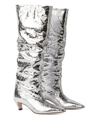 ruched foiled leather boots Highlights - Silver-tone - Calf leather - Foiled finish - Crinkled finish - Ruched detailing - Pointed toe - Slip-on style - Kitten heel - Leather sole Made in Italy Composition Sole: Calf Leather 100% Outer: Calf Leather 100% Lining: Calf Leather 100%