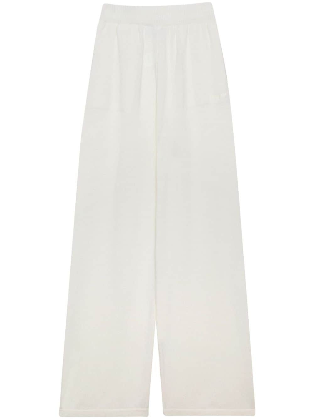logo-embroidered wide-leg trousers Highlights - White - Wide leg - Elasticated waistband - Draped side pockets Made In Italy Composition Wool 70%, Cashmere 30% SIZE & FIT FittingInformation Designed with a wide-leg cut, these trousers allow for a close fit at the waist and offer a loose and roomy fit over the leg The elasticated waist allows for a comfortable fit Made with a midweight knit, this piece offers some stretch This piece fits true to size – take your usual size