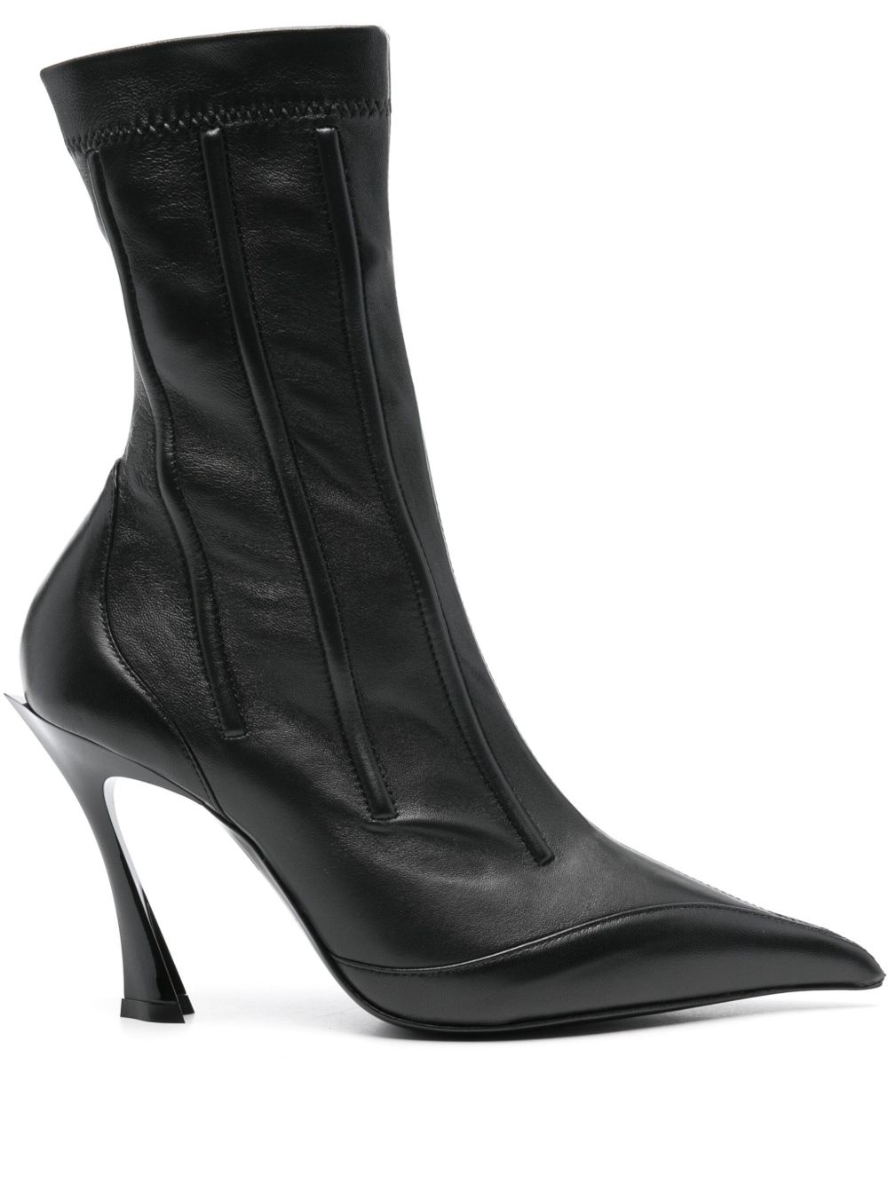 95mm seam-detail boots Highlights - Black - Calf leather - Smooth grain - Pointed toe - Seam detailing - Branded leather insole - 95mm high sculpted heel - Leather and rubber sole - Side zip fastening Made in Italy Composition Lining: Calf Leather 100% Outer: Calf Leather 100% Sole: Calf Leather 100%, Rubber 100% SIZE & FIT Measurement CIRCUMFERENCE 9.44 in(24 cm) HEEL 3.74 in(9.5 cm) HEIGHT 7.28 in(18.5 cm)