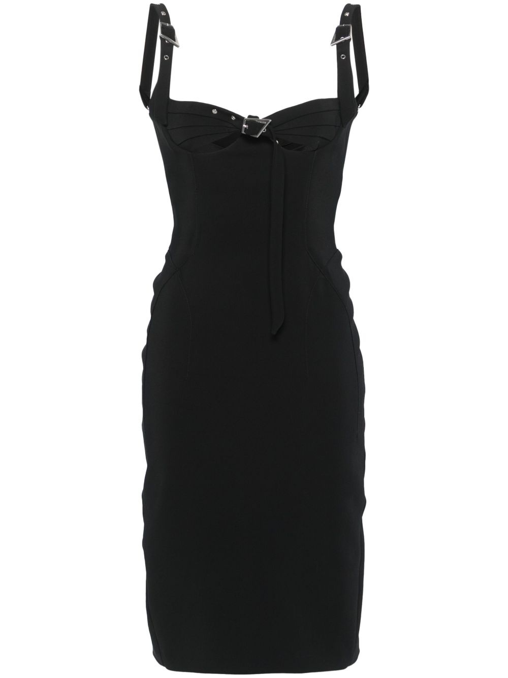 bucked bustier midi dress Highlights - Black - Stretch-design - Bustier-style neckline - Buckle-strap fastening - Concealed rear hook and zip fastening - Buckle-fastening shoulder straps - Sleeveless - Pleat detailing - Cut-out detailing - Dart detailing - Rear slit - Built-in underwire bra - Full lining - Straight hem - Mid-length Imported Composition Outer: Polyamide 100%, Viscose 98%, Elastane 4% Lining: Viscose 57%, Polyester 43% SIZE & FIT Model measurements Height 5 ft 10 in(1.77 m) Bust/Chest 33.07 in(84 cm) Hips 37 in(94 cm) Waist 24.8 in(63 cm) FittingInformation Designed for a slim fit that sits just away from the body offering a close yet comfortable fit The adjustable shoulder straps allow for a preferred fit when worn Made from a midweight fabric