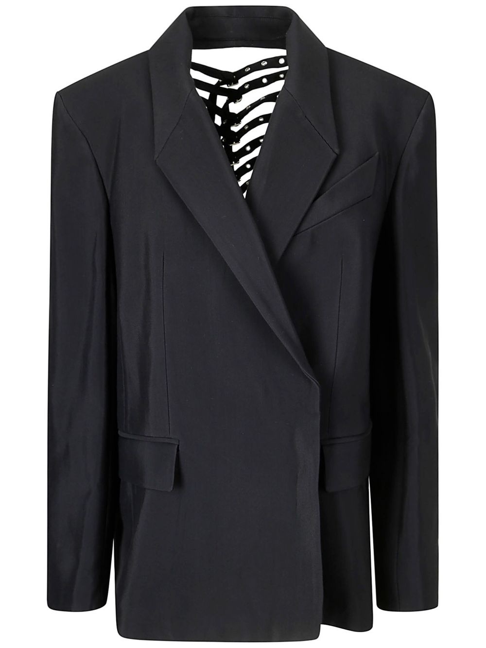 buckled blazer Highlights - Black - Concealed front fastening - Shawl collar - Long sleeves - Chest welt pocket - Two front flap pockets - Open back - Buckle-strap fastening - Straight hem Imported Composition Outer: Viscose 76%, Virgin Wool 24% Lining: Cupro 100%