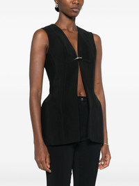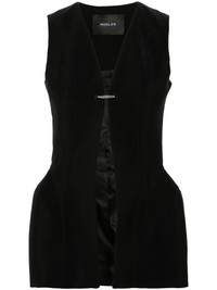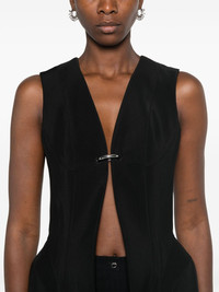 corseted pierced vest Highlights - Black - Twill weave - Corset style - Seam detailing - V-neck - Sleeveless - Metallic detail - Full lining - Straight hem Imported Composition Outer: Viscose 76%, Virgin Wool 24% Lining: Cupro 100% SIZE & FIT Model measurements Height 5 ft 10 in(1.78 m) Bust/Chest 31.49 in(80 cm) Hips 37 in(94 cm) Waist 23.62 in(60 cm) Measurement CHEST 33.07 in(84 cm) LENGTH 26.77 in(68 cm) WAIST 29.92 in(76 cm) FittingInformation Designed for a slim fit that sits just away from the body offering a close yet comfortable fit Made from a midweight non-stretch fabric This piece fits true to size – take your usual size Washing instructions Dry Clean Only