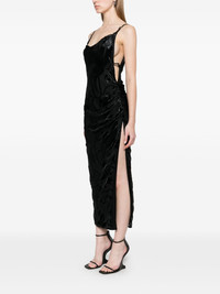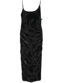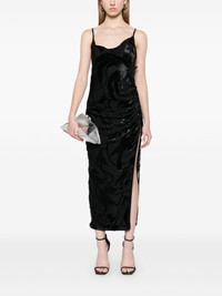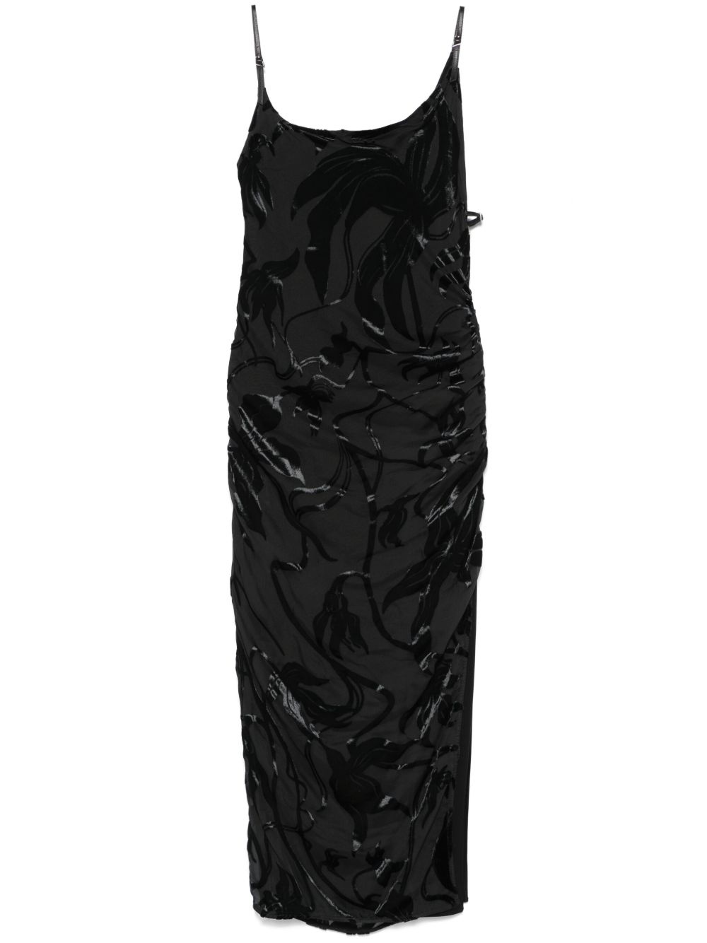 flocked midi dress Highlights - Black - Side buckle fastening - Adjustable shoulder straps - Side slit - Ruched detailing Imported Composition Outer: Viscose 72%, Silk 28% Lining: Viscose 95%, Spandex/Elastane 5% SIZE & FIT Model measurements Height 5 ft 9 in(1.75 m) Bust/Chest 31.88 in(81 cm) Hips 34.64 in(88 cm) Waist 24.01 in(61 cm) FittingInformation Designed for a slim fit that sits just away from the body offering a close yet comfortable fit The adjustable shoulder straps allow for a preferred fit when worn Made from a midweight fabric
