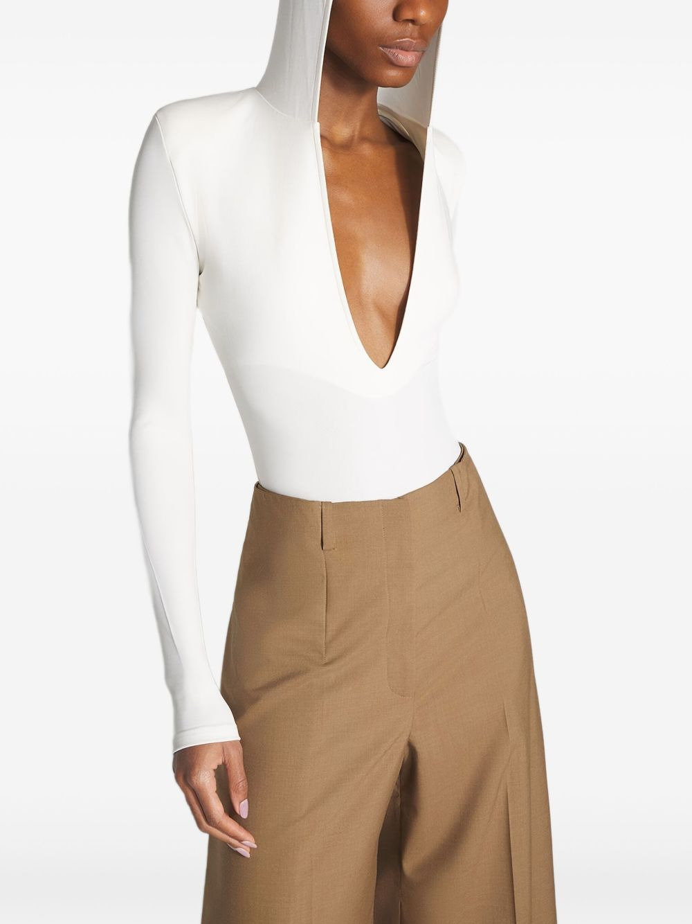 hooded plunge-neck bodysuit Highlights - Off-white - Hooded neckline - Plunge neck - Long sleeves - Shoulder pads - Just a reminder that this piece must be tried on over your own garments. Imported Composition Fabric 100% Washing instructions Read Manufacturer Guidelines