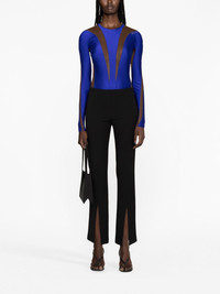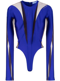 Illusion panelled bodysuit Mugler's illusion designs are a longstanding trope, and this ultraviolet blue bodysuit continues that legacy. It combines jersey panels with sheer tulle to create the mirage of daring and spiralling cut-outs through the bodice and arms. Highlights - Ultra violet blue - Stretch-jersey - Mesh panelling - Rear zip fastening - Round neck - Long sleeves - Thong style - Press-stud fastening at base - Just a reminder that this piece must be tried on over your own garments. Imported Composition Cotton 100%, Polyamide 80%, Spandex/Elastane 20% SIZE & FIT Model measurements Height 5 ft 11 in(1.8 m) Bust/Chest 34.25 in(87 cm) Hips 35.82 in(91 cm) Waist 24.8 in(63 cm)