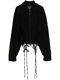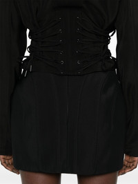 laced corset jacket Highlights - Black - Front zip fastening - Classic collar - Long sleeves Imported Composition Outer: Viscose 76%, Virgin Wool 24% Lining: Cupro 100% SIZE & FIT Model measurements Height 5 ft 11 in(1.8 m) Bust/Chest 32.67 in(83 cm) Hips 36.22 in(92 cm) Waist 24.4 in(62 cm) FittingInformation Designed to be unstructured, offering a loose fit throughout The tie fastening gives an adaptable and personalised fit Made from a midweight non-stretch fabric