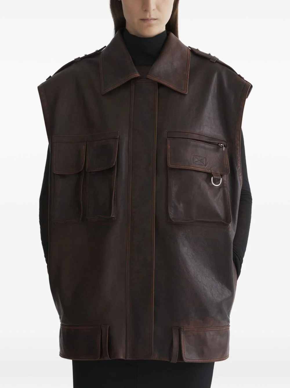 leather military gilet brown patch pockets pointed collar sleeveless epaulettes d-ring detail Made in Italy Composition Calf Leather 100% Washing instructions Read Manufacturer Guidelines