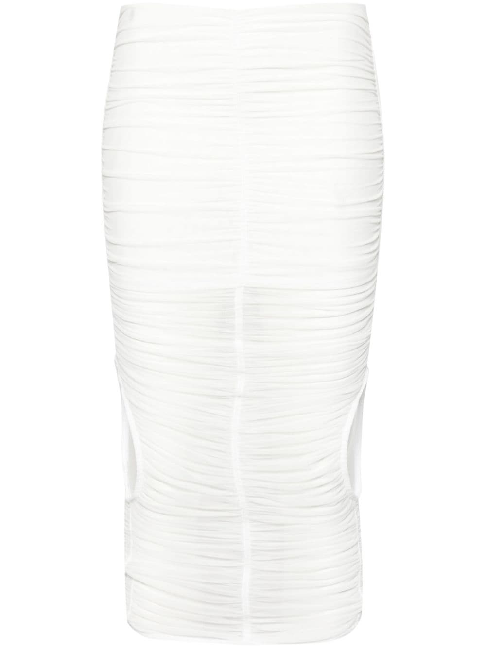mesh ruched midi skirt Highlights - White - Stretch-design - Mesh panelling - Ruched detailing - Cut-out detailing - Bow detailing - Internal logo tag - Partial lining - Mid-length - Curved hem Imported Composition Polyamide 94%, Elastane 6% SIZE & FIT Model measurements Height 5 ft 9 in(1.75 m) Bust/Chest 34.64 in(88 cm) Hips 36.61 in(93 cm) Waist 26.37 in(67 cm) FittingInformation This midi-length skirt is intended to be worn just below the waist Made from a lightweight stretch fabric, this piece offers elasticity and flexibility when worn This piece fits true to size – take your usual size