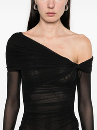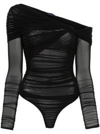 off-shoulder ruched bodysuit Highlights - Black - Press-stud fastening - Semi-sheer construction - Twist detailing - Just a reminder that this piece must be tried on over your own garments. Imported Composition Other fibres 100% SIZE & FIT Model measurements Height 5 ft 10 in(1.78 m) Bust/Chest 33.46 in(85 cm) Hips 36.22 in(92 cm) Waist 23.22 in(59 cm) FittingInformation Designed for a close fit throughout Made from a lightweight stretch fabric, this piece offers elasticity and flexibility when worn