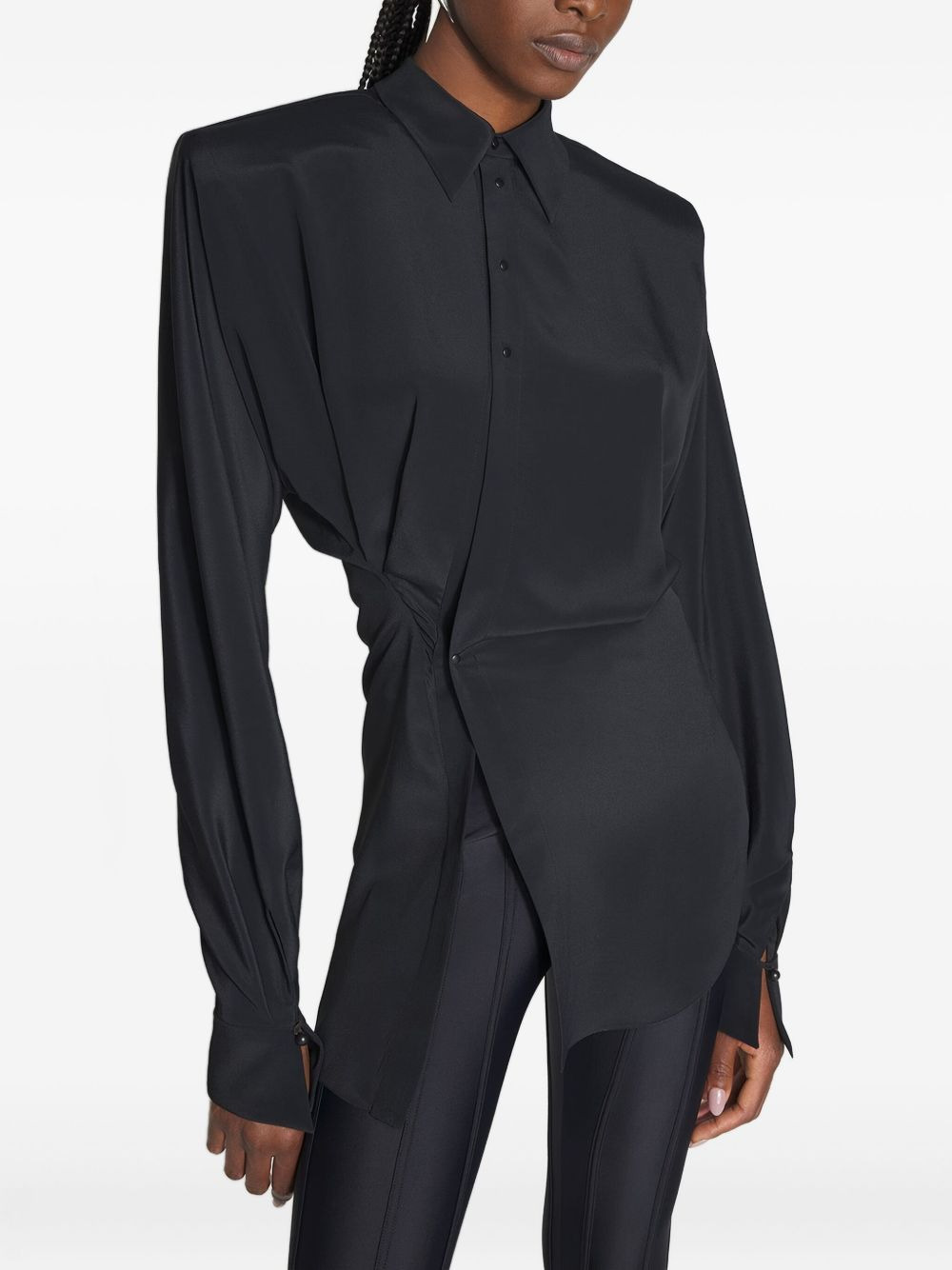 padded-shoulder asymmetrical shirt Highlights - Black - Padded shoulders - Asymmetrical hem - Long sleeves - Button fastening - Wrap effect Imported Composition Fabric 100% Washing instructions Read Manufacturer Guidelines