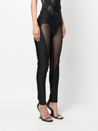 panelled skinny trousers Mugler’s penchant for contoured silhouettes is displayed with these skinny trousers. The jersey construction is panelled with semi-sheer mesh inserts that create an illusionary effect. Highlights - Black - Jersey texture - Mesh detailing - Sheer panelling - Belt loops - Concealed fly and button fastening - Two side slash pockets - Skinny cut Imported Composition Polyamide 78%, Spandex/Elastane 22% SIZE & FIT Model measurements Height 5 ft 10 in(1.78 m) Bust/Chest 33.46 in(85 cm) Hips 36.22 in(92 cm) Waist 23.22 in(59 cm) Measurement FRONT RISE 10.62 in(27 cm) HIPS 29.13 in(74 cm) WAIST 26.77 in(68 cm) FittingInformation Designed for a close fit throughout Made from a midweight stretch fabric, this piece offers elasticity and flexibility when worn This piece fits small – take one size up