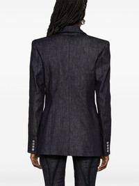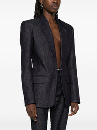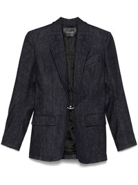 pierced tailored blazer Highlights - Navy blue - Clasp fastening - Chest welt pocket - Two side flap pockets - Shoulder pads Imported Composition Outer: Cotton 98%, Spandex/Elastane 2% Lining: Cupro 100% SIZE & FIT Model measurements Height 5 ft 11 in(1.8 m) Bust/Chest 32.67 in(83 cm) Hips 36.22 in(92 cm) Waist 24.4 in(62 cm) FittingInformation Designed for a slim fit that sits just away from the body offering a close yet comfortable fit The internal shoulder pads offer a structured shape Constructed from stretch denim, this piece offers a stretch fit with durability