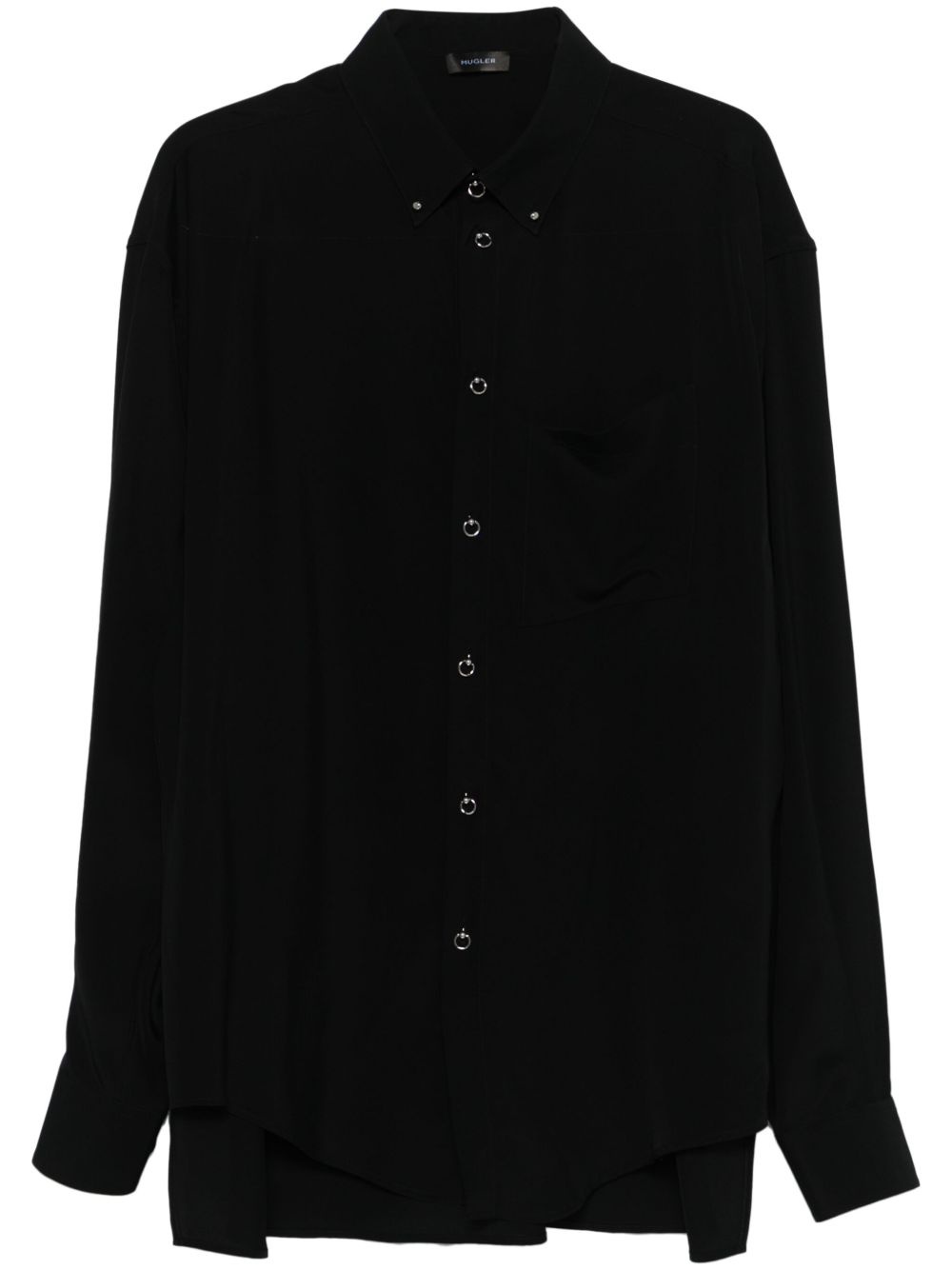 piercing-detail shirt Highlights - Black - Lightweight construction - Piercing-button detail - Front button fastening - Classic collar - Drop shoulder - Buttoned-cuff sleeves - Chest patch pocket - High-low hem Imported Composition Viscose 100% SIZE & FIT Model measurements Height 6 ft 2 in(1.87 m) Bust/Chest 37.79 in(96 cm) Hips 37.79 in(96 cm) Waist 30.31 in(77 cm) FittingInformation Designed to be unstructured, offering a loose fit throughout Made from a midweight non-stretch fabric