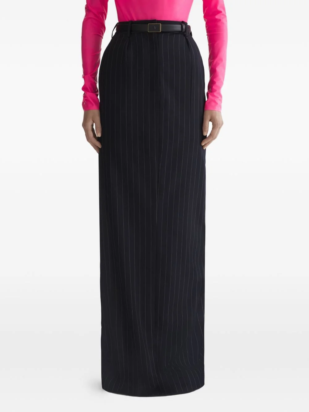 pinstripe slit skirt Highlights - Dark blue - Pinstripe pattern - Belt - Rear slit - Concealed zip fastening - High-waisted Imported Composition Fabric 100% Washing instructions Read Manufacturer Guidelines