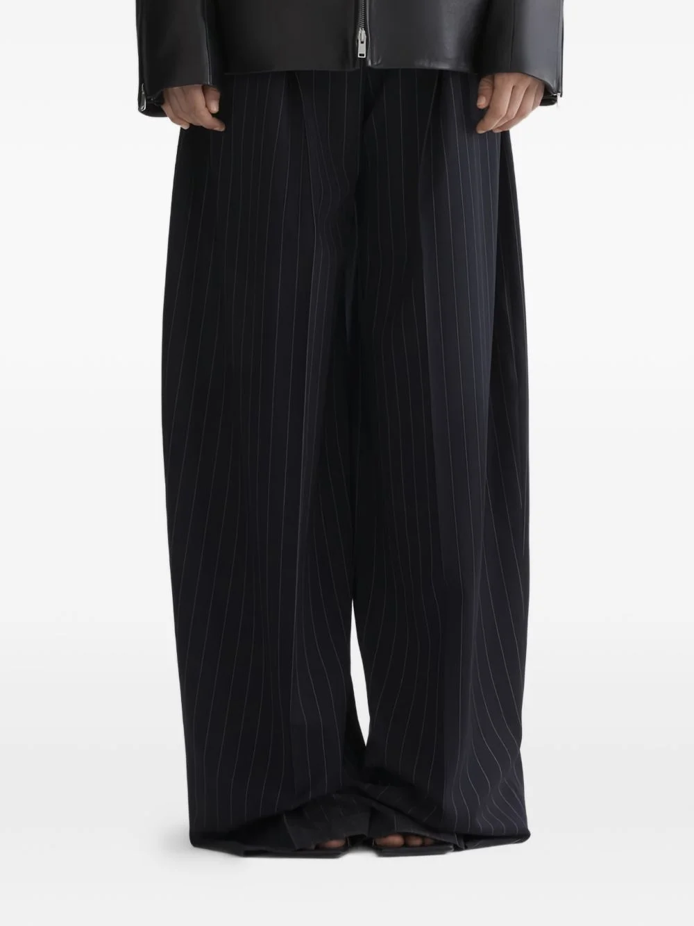 pinstriped wide leg trousers Highlights - Dark blue - Pinstriped design - Wide leg - Button detail - High-waisted - Back pocket Imported Composition Fabric 100% Washing instructions Read Manufacturer Guidelines