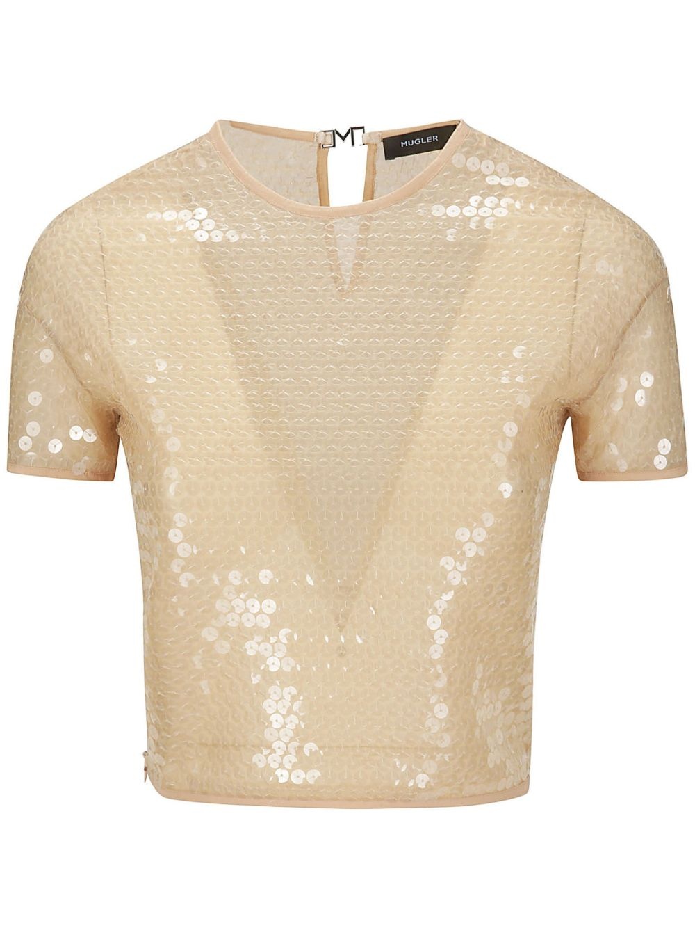 short-sleeved sequinned blouse Highlights - Light beige - Sequin design - Round neck - Short sleeves - Rear hook fastening - Straight hem - Cropped Imported Composition Polyamide 83%, Elastane 17%