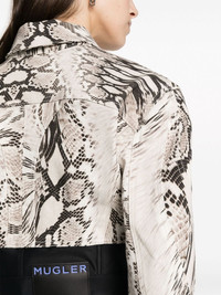 Snake cropped panelled denim jacket Highlights - Beige/brown/black - Stretch-cotton - Snakeskin print - Colour-block panelled design - Logo patch to the rear - Classic collar - Front press-stud fastening - Long sleeves - Buttoned cuffs - Two chest flap pockets - Straight hem - Cropped Made in Italy Composition Cotton 98%, Elastane 2% SIZE & FIT Model measurements Height 5 ft 11 in(1.8 m) Bust/Chest 31.49 in(80 cm) Hips 36.22 in(92 cm) Waist 25.59 in(65 cm) FittingInformation Designed for a slim fit that sits just away from the body offering a close yet comfortable fit Cropped in length Made from a midweight stretch fabric, this piece offers elasticity and flexibility when worn This piece fits true to size – take your usual size Washing instructions Dry Clean Only