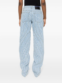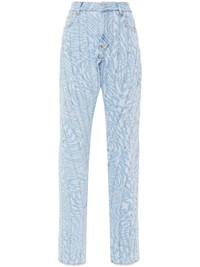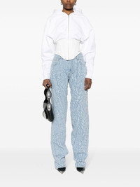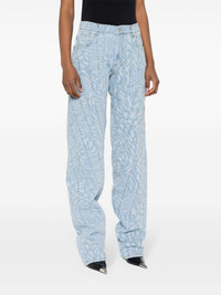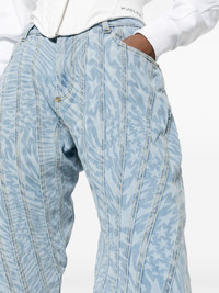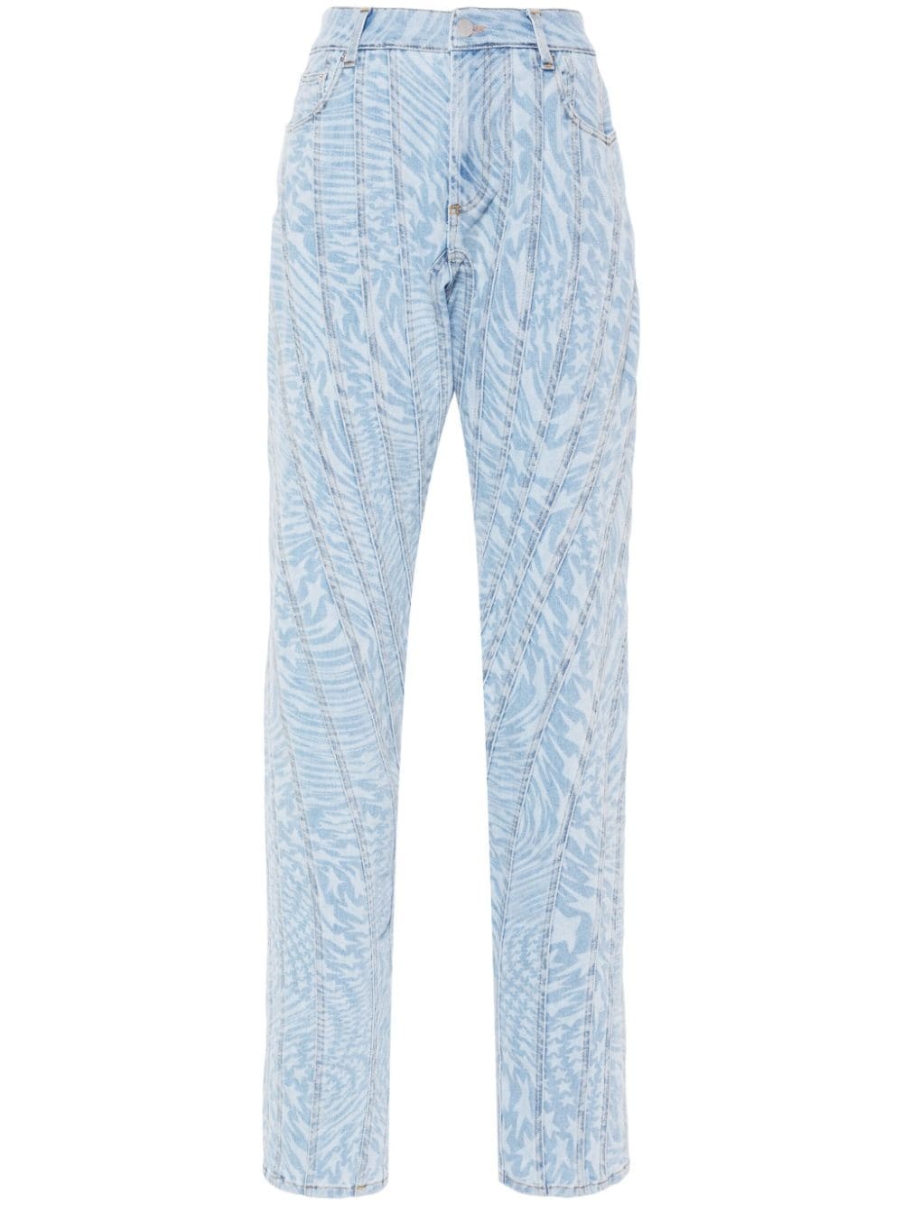 star-print tapered jeans A contoured take on classic denim styles, these Spiral jeans from Mugler are detailed with contrast topstitching and panels that create a distinctive sculpted look. Further embellishing this pair is a star print that blends in with the light blue hue. Highlights - Blue - Stretch-cotton - Denim - Star print - Mid-rise - Belt loops - Classic five pockets - Signature multi-seam spiral construction - Tapered leg - Logo-debossed patch to the rear - Concealed fly and button fastening Made in Italy Composition Cotton 72%, Elastomultiester 28% SIZE & FIT Model measurements Height 5 ft 11 in(1.8 m) Bust/Chest 31.49 in(80 cm) Hips 36.61 in(93 cm) Waist 24.4 in(62 cm) FittingInformation Designed with a wide leg cut, these jeans allow for a close fit at the waist and offer a loose and roomy fit over the leg Constructed from stretch denim, this piece offers a stretch fit with durability This piece fits true to size – take your usual size Washing instructions Dry Clean Only