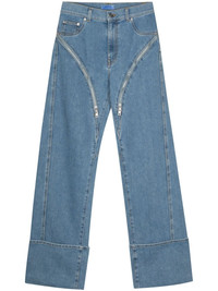 zipped wide-leg jeans Mugler's famous curved lines appear as zips on these straight-leg jeans. Crafted from soft stretch cotton in medium blue, they feature a classic five-pocket design with turn-up hems and a contrasting logo patch at the rear. Highlights - Blue - Stretch-cotton - Denim - Mid-rise - Belt loops - Classic five pockets - Decorative zip detailing - Seam detailing - Straight leg - Turn-up ankles - Applique logo to the rear - Concealed fly and button fastening Made in Italy Composition Cotton 72%, Elastomultiester 28%