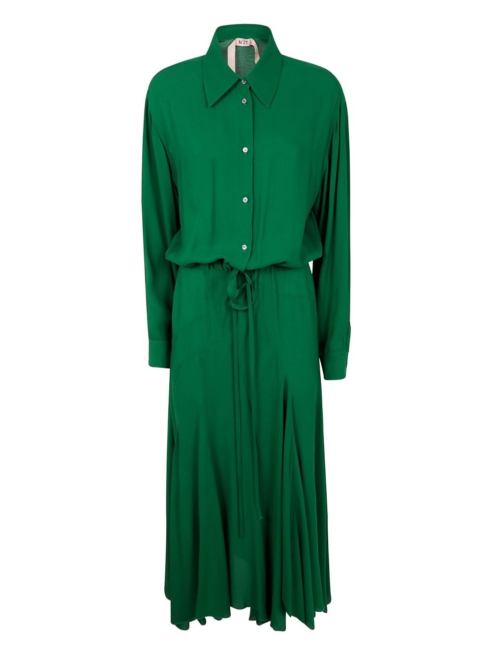 belted dress Highlights - Emerald green - Front button fastening - Drawstring waist - Pointed flat collar Imported Composition Viscose 100%