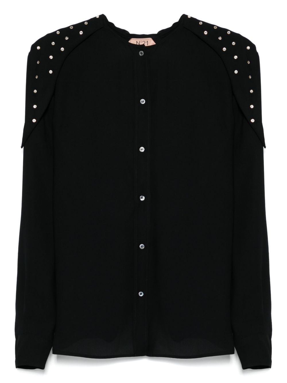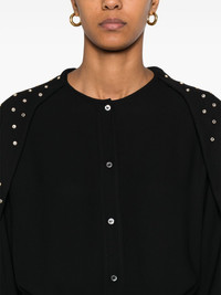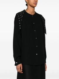 collarless shirt Highlights - Black - Front button fastening - Buttoned cuffs - Glass crystal embellishment Imported Composition Viscose 100%, glass 80%, Metal 20% SIZE & FIT Model measurements Height 5 ft 10 in(1.77 m) Bust/Chest 33.07 in(84 cm) Hips 37 in(94 cm) Waist 24.8 in(63 cm) FittingInformation Designed to be unstructured, offering a loose fit throughout Made from a lightweight non-stretch fabric Washing instructions Dry Clean Only