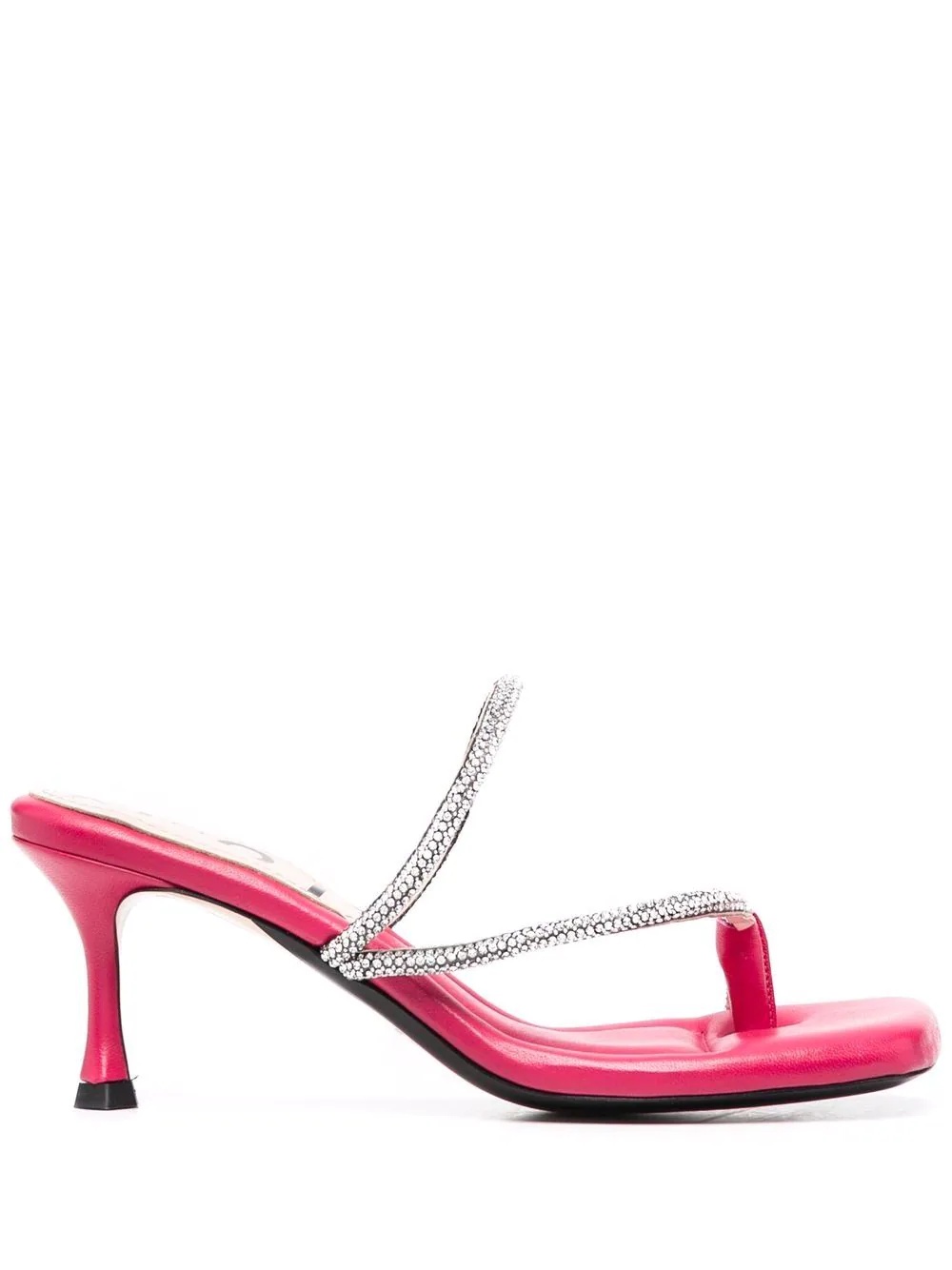 70mm crystal-embellished strappy sandals A classic silhouette is updated to contemporary status with these open-toe mules from Nº21's SS22 collection. In an all hot fuchsia pink hue, these shoes feature a crystal-embellished strappy design and sit upon a sculpted high heel. Highlights - Fuchsia pink - Leather - Open toe - Thong style - Branded insole - Slip-on style - Mid heel - Leather sole Made in Italy Composition Outer: Leather 100%, glass 100% Sole: Leather 100% Lining: Leather 100% SIZE & FIT Measurement HEEL 2.75 in(7 cm) Sole height 0.39 in(1 cm)