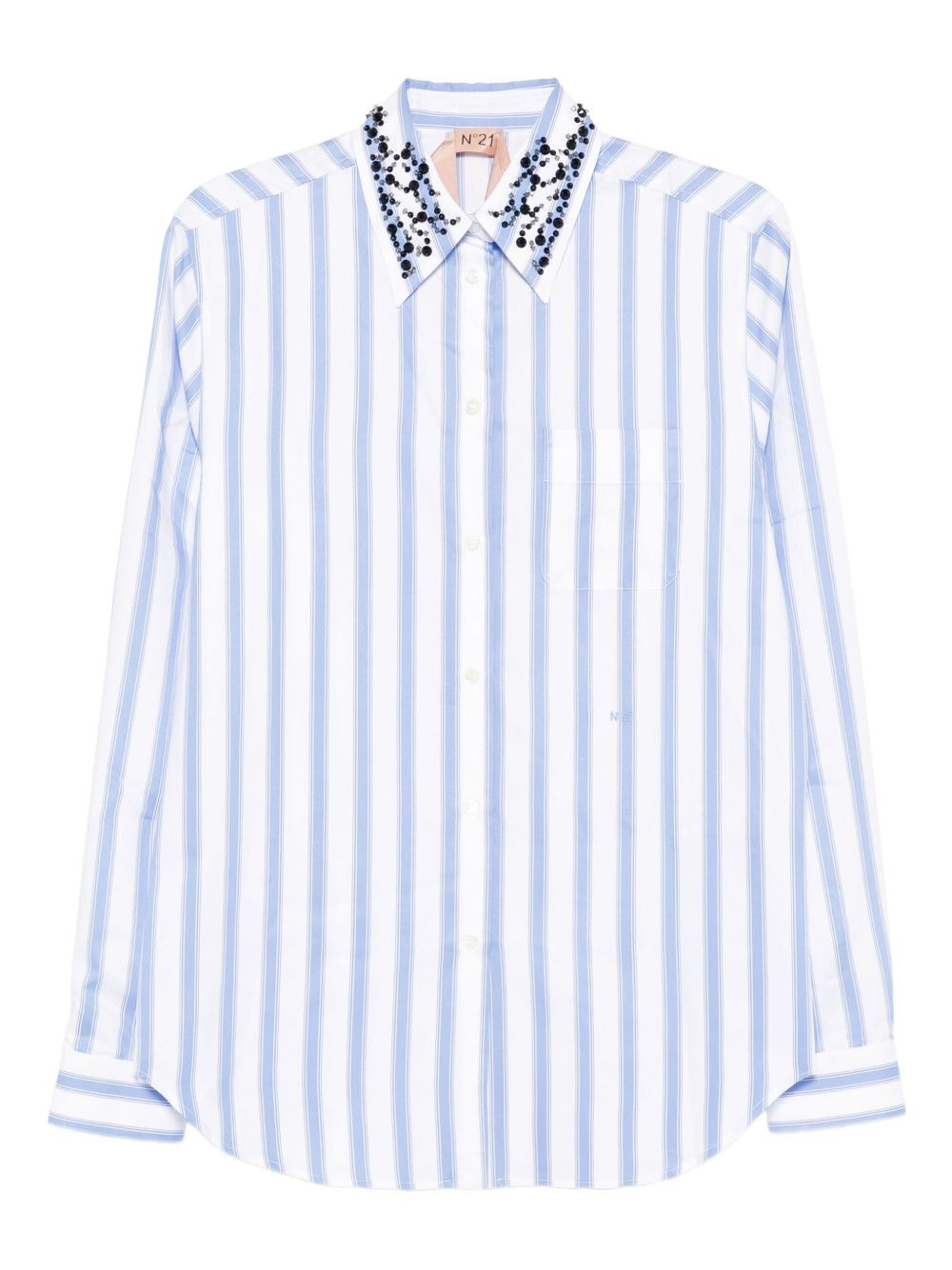 embellished striped shirt Highlights - White blue - Striped pattern - Long sleeves - Button fastening - Embellished collar - Pointed collar Made in Italy Composition Viscose 88%, Polyamide 12% Washing instructions Dry Clean Only