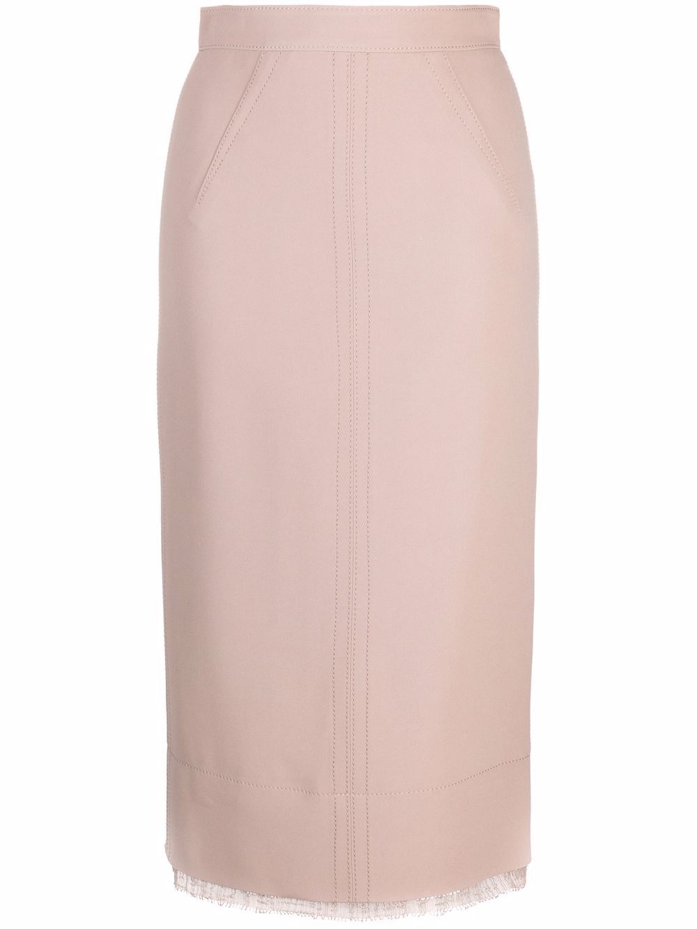 lace trim pencil skirt A fine example of Nº21 timelessly feminine aesthetic, this AW21 pencil skirt boasts a charming dusty pink hue and a dainty lace trim at the hem. Imported Composition Outer: Viscose 50%, Acetate 50% Lining: Cupro 100% SIZE & FIT Model measurements Height 5 ft 10 in(1.78 m) Bust/Chest 31.49 in(80 cm) Hips 36.22 in(92 cm) Waist 25.59 in(65 cm) FittingInformation This piece fits true to size. We recommend you get your regular size Cut for a slim fit Made with a mid-weight non-stretch fabric Washing instructions Dry Clean Only