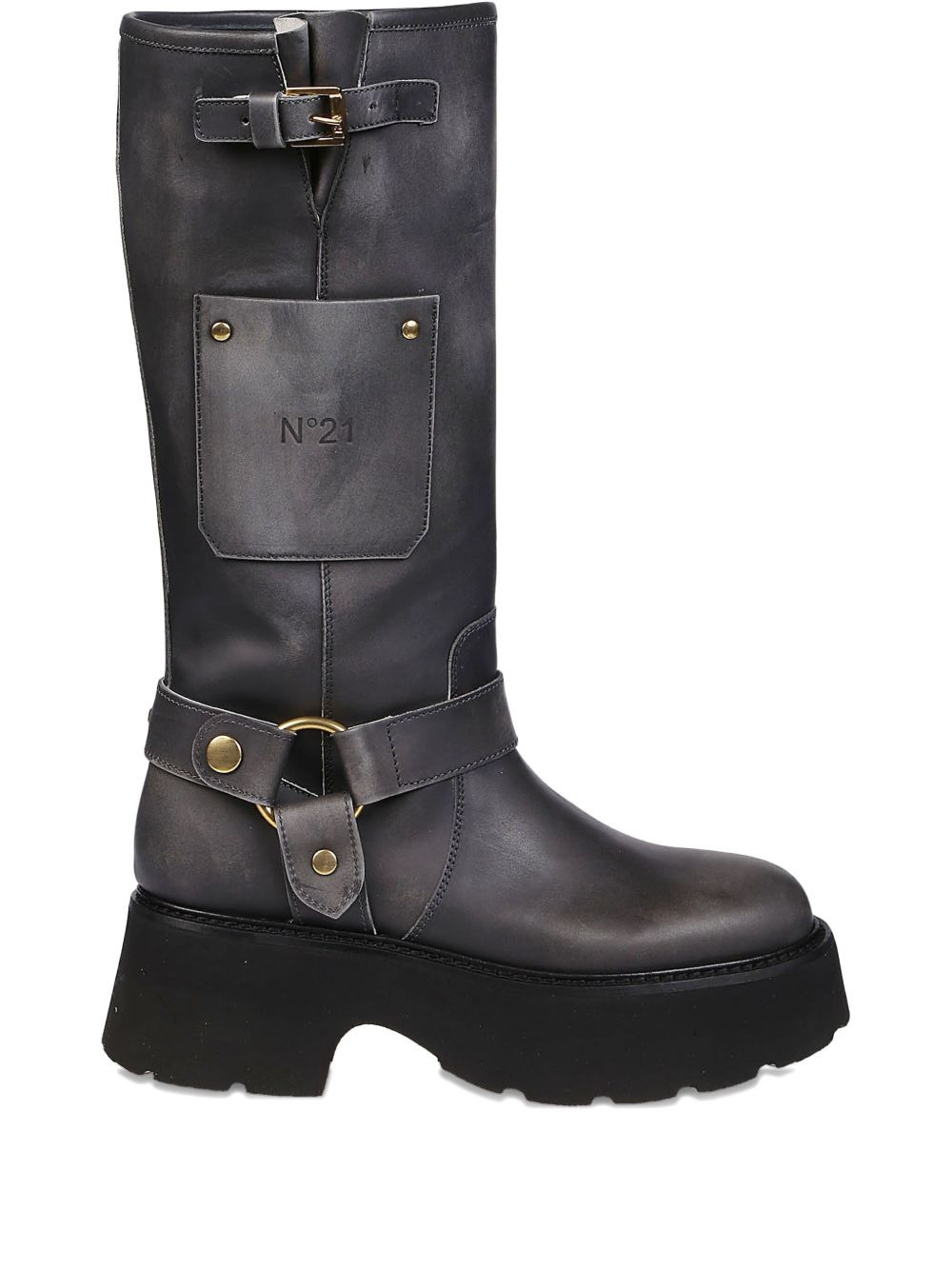 Leather Knee-High Boots Highlights - Grey - Calf leather - Platform sole - Buckle strap - Branded patch - Ring detail Made in Italy Composition Inner: Calf Leather 100% Outer: Leather 100% Sole: Calf Leather 100% SIZE & FIT Measurement HEEL 2.36 in(6 cm)