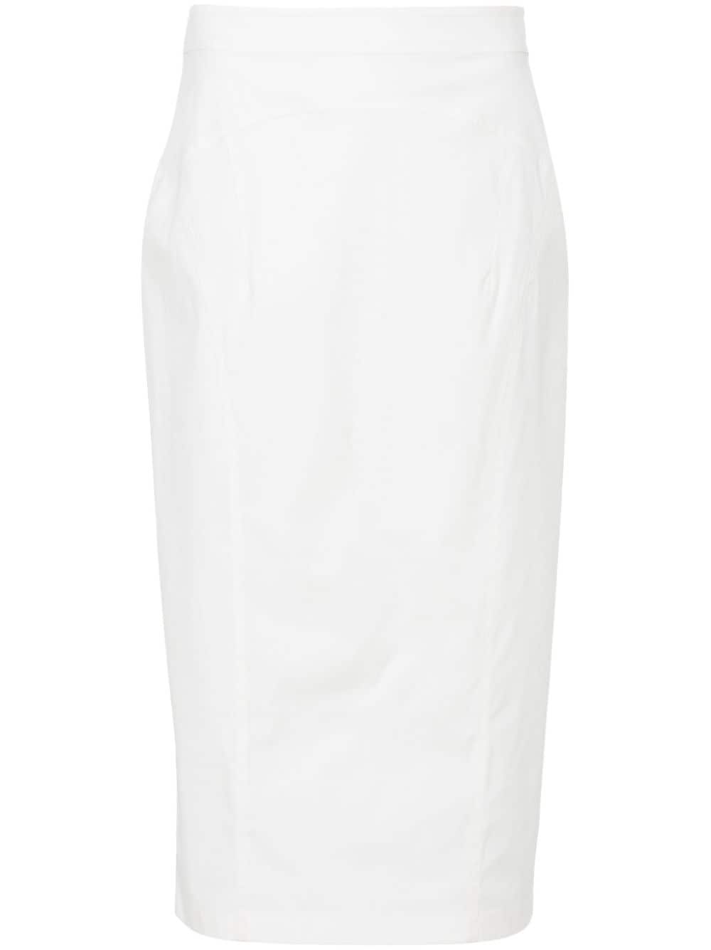 panelled midi skirt Highlights - Ecru - Cotton blend - Panelled design - Central rear vent - Mid-length - Straight hem - Concealed rear zip fastening Imported Composition Cotton 80%, Polyamide 16%, Elastane 4% SIZE & FIT Model measurements Height 5 ft 11 in(1.8 m) Bust/Chest 31.49 in(80 cm) Hips 36.22 in(92 cm) Waist 25.59 in(65 cm) FittingInformation This midi-length skirt is intended to be worn just below the waist The vented hem offers movement at the rear Made from a midweight stretch fabric, this piece offers elasticity and flexibility when worn This piece fits true to size – take your usual size
