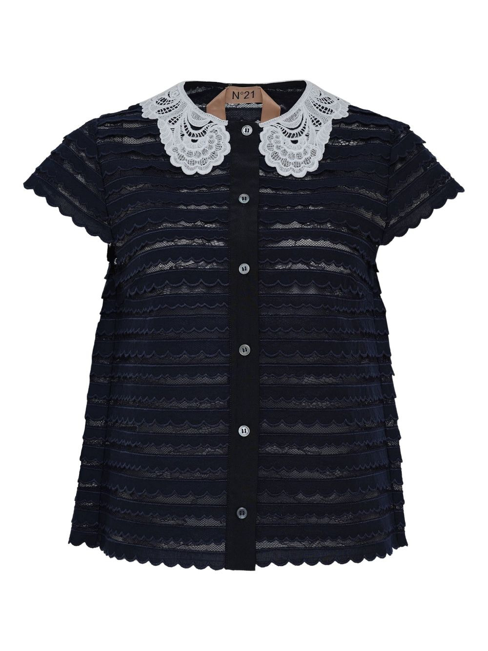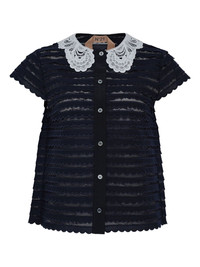 peterpan collar scallop top Highlights - Dark blue - Scalloped hem - Lace collar - Short sleeves - Button front Imported Composition Cotton 50%, Polyamide 50% Washing instructions Read Manufacturer Guidelines