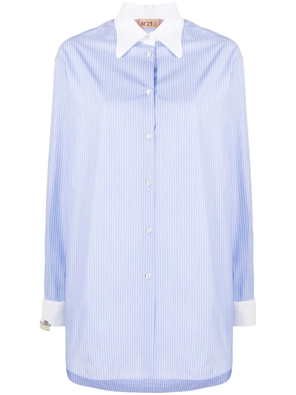 pinstriped long-line shirt Bring some glitz into your daily looks with this blue cotton pinstriped longline shirt from Nº21, complete with pearl and crystal embellished cufs. Impossible to resist, right? Get it, you won't regret it. Featuring a pointed collar, a front button fastening, a curved hem and crystal and pearl embellished cuffs. Made in Italy Composition Cotton 100%, Acetate 69%, Silk 31% SIZE & FIT Model measurements Height 5 ft 11 in(1.8 m) Bust/Chest 33.07 in(84 cm) Hips 37.4 in(95 cm) Waist 25.19 in(64 cm) FittingInformation This piece fits true to size. We recommend you get your regular size Cut for a loose fit Made with a mid-weight non-stretch fabric