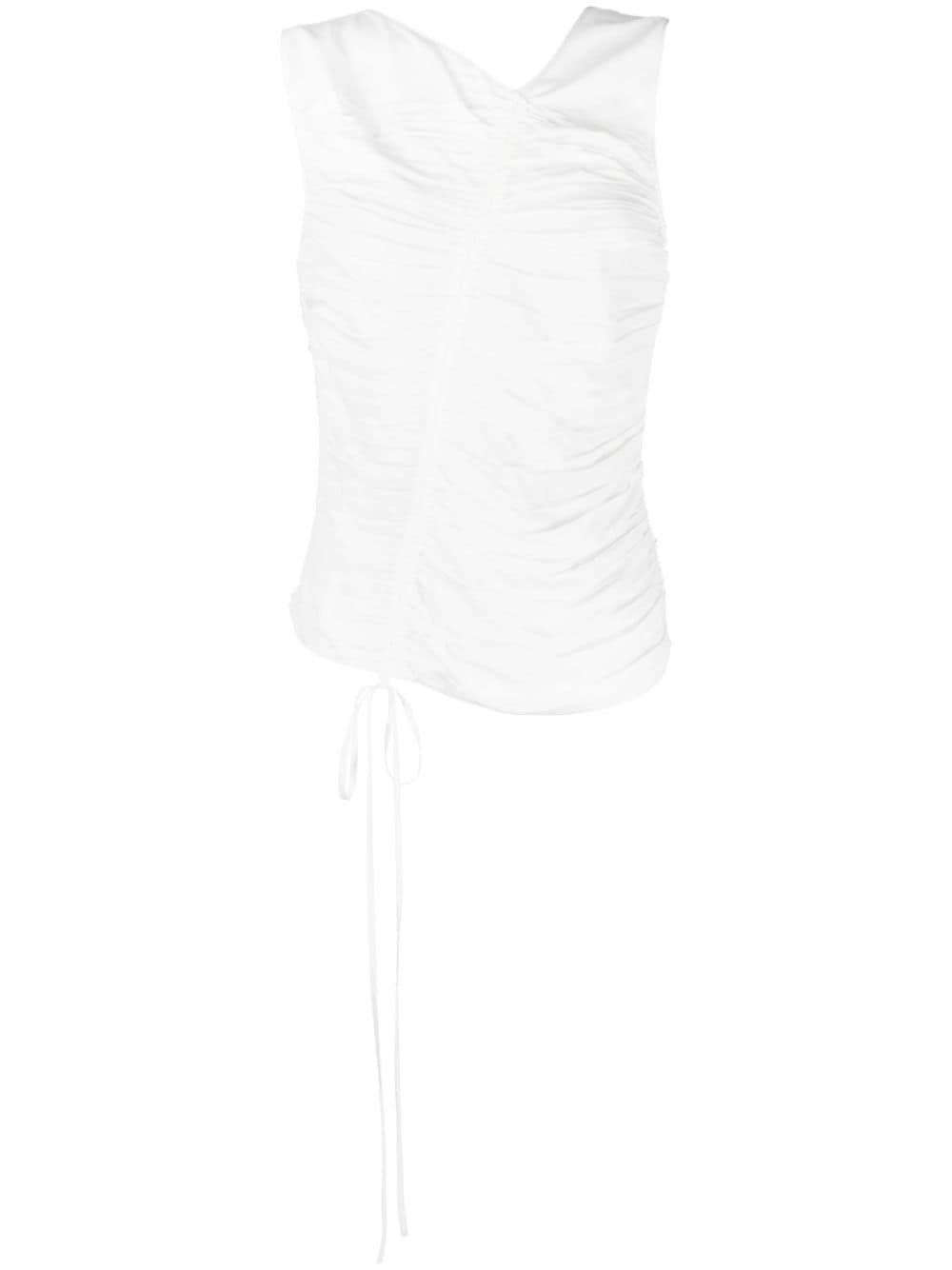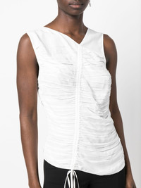 ruched-detail sleeveless blouse white ruched detailing V-neck V-neck sleeveless drawstring fastening asymmetric hem Made in Italy Composition Acetate 69%, Silk 31% SIZE & FIT Model measurements Height 5 ft 10 in(1.77 m) Bust/Chest 32.28 in(82 cm) Hips 35.03 in(89 cm) Waist 25.19 in(64 cm) Washing instructions Dry Clean Only