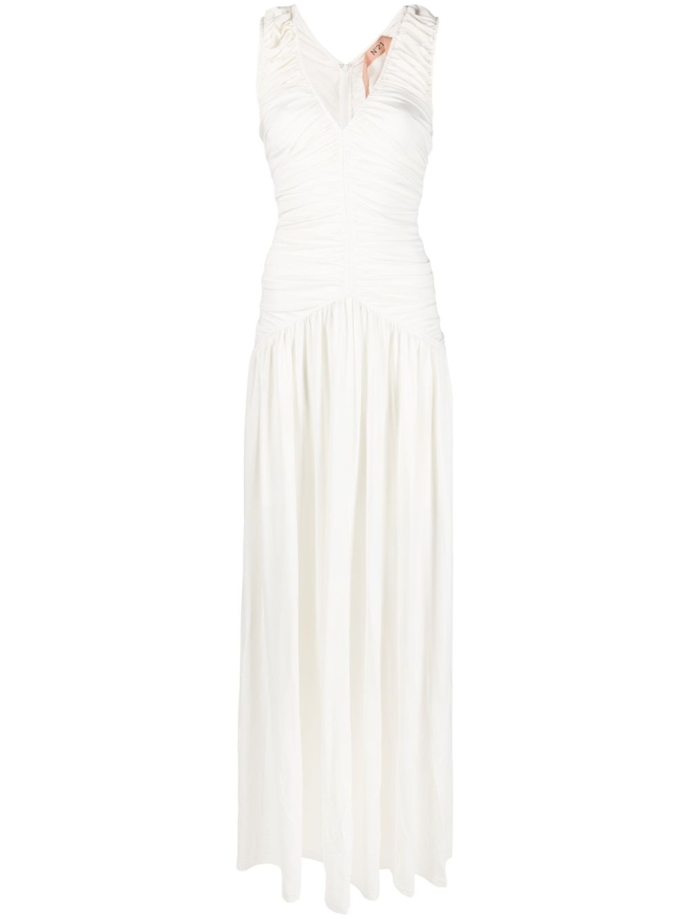 ruched-detailing long dress Highlights - Cream white - Stretch-design - Ruched bodice - V-neck - Sleeveless - Rear zip fastening - Fitted waistline - Flared skirt - Floor-length Imported Composition Viscose 72%, Polyester 22%, Elastane 6% SIZE & FIT Model measurements Height 5 ft 10 in(1.77 m) Bust/Chest 31.49 in(80 cm) Hips 36.22 in(92 cm) Waist 22.44 in(57 cm) FittingInformation Designed for a close fit throughout Particularly long in length; consider your own measurements Made from a midweight stretch fabric, this piece offers elasticity and flexibility when worn This piece fits true to size – take your usual size