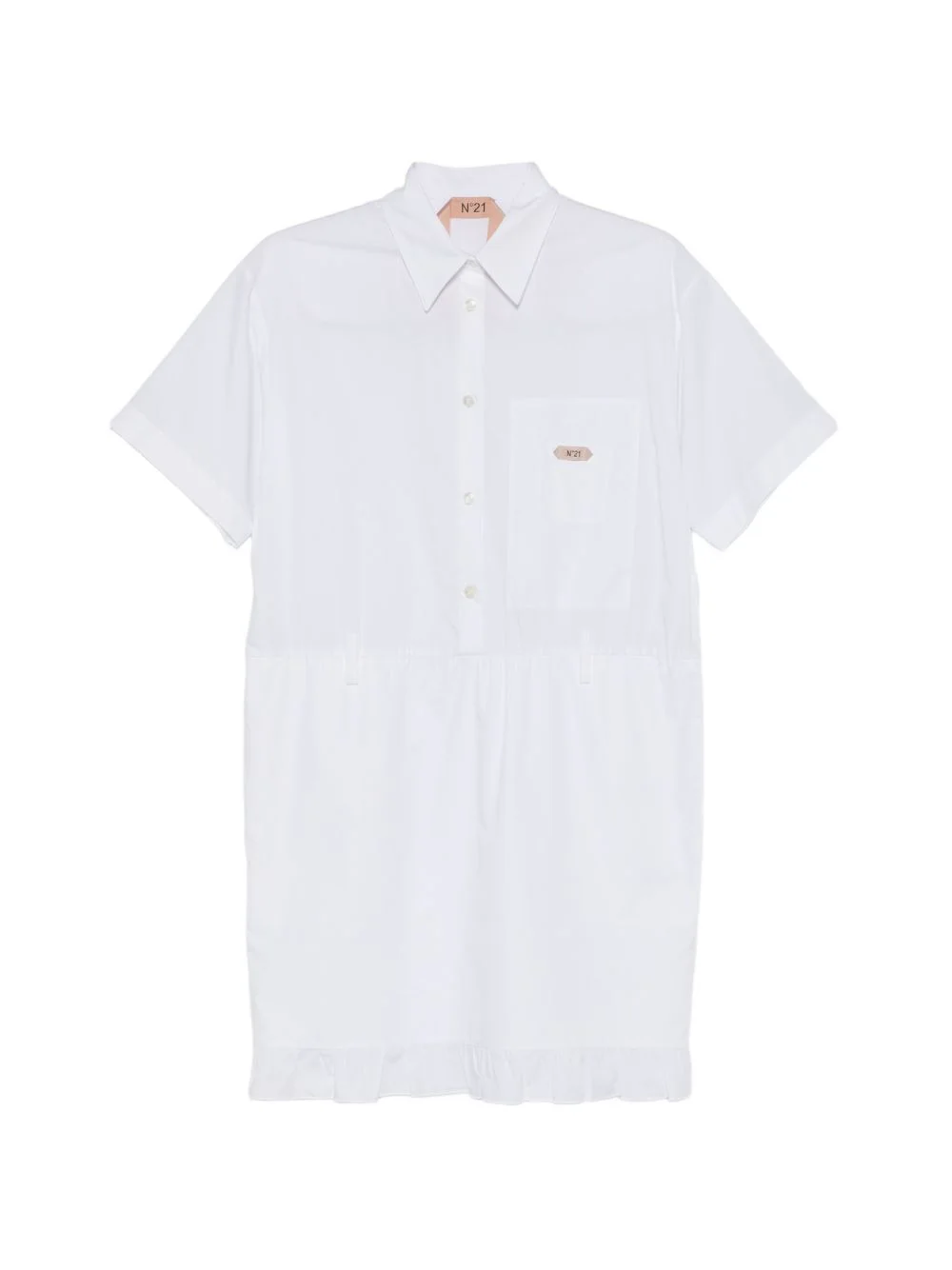 ruffled woven mini dress Highlights - White - Short sleeves - Chest pocket - Ruffle trim - Button fastening - Gathered waist Made in Italy Composition Cotton 100% Washing instructions Machine Wash