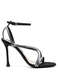 100mm crystal-embellished sandals Nº21's sandals comprise slim overlapping straps encrusted with sparkling crystals that lend a touch of sparkle. This black pair rests on a subtly fluted 100mm heel. Highlights - Black - Goatskin/cotton blend - Strap detailing - Crystal embellishment - Buckle-fastening ankle strap - Open toe - 100mm high heel Made in Italy Composition Cotton 100% SIZE & FIT Measurement HEEL 3.93 in(10 cm)