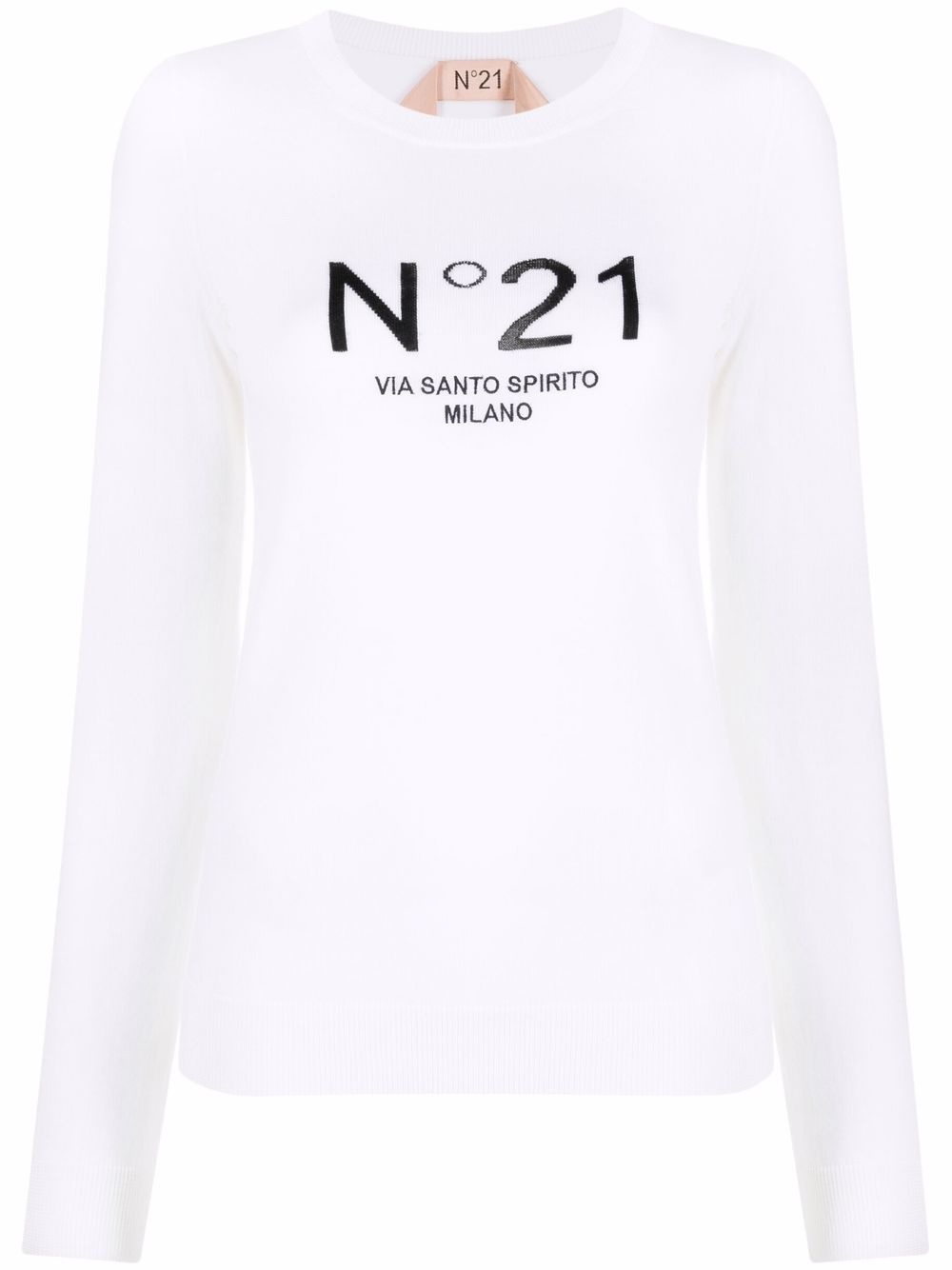 virgin wool logo jumper white virgin wool knitted construction ribbed detailing intarsia-knit logo round neck long sleeves Imported Composition Virgin Wool 100% SIZE & FIT Model measurements Height 5 ft 11 in(1.8 m) Bust/Chest 31.88 in(81 cm) Hips 35.03 in(89 cm) Waist 24.01 in(61 cm) FittingInformation This piece fits true to size. We recommend you get your regular size Cut for a relaxed fit Made with a mid-weight fabric Washing instructions Hand Wash